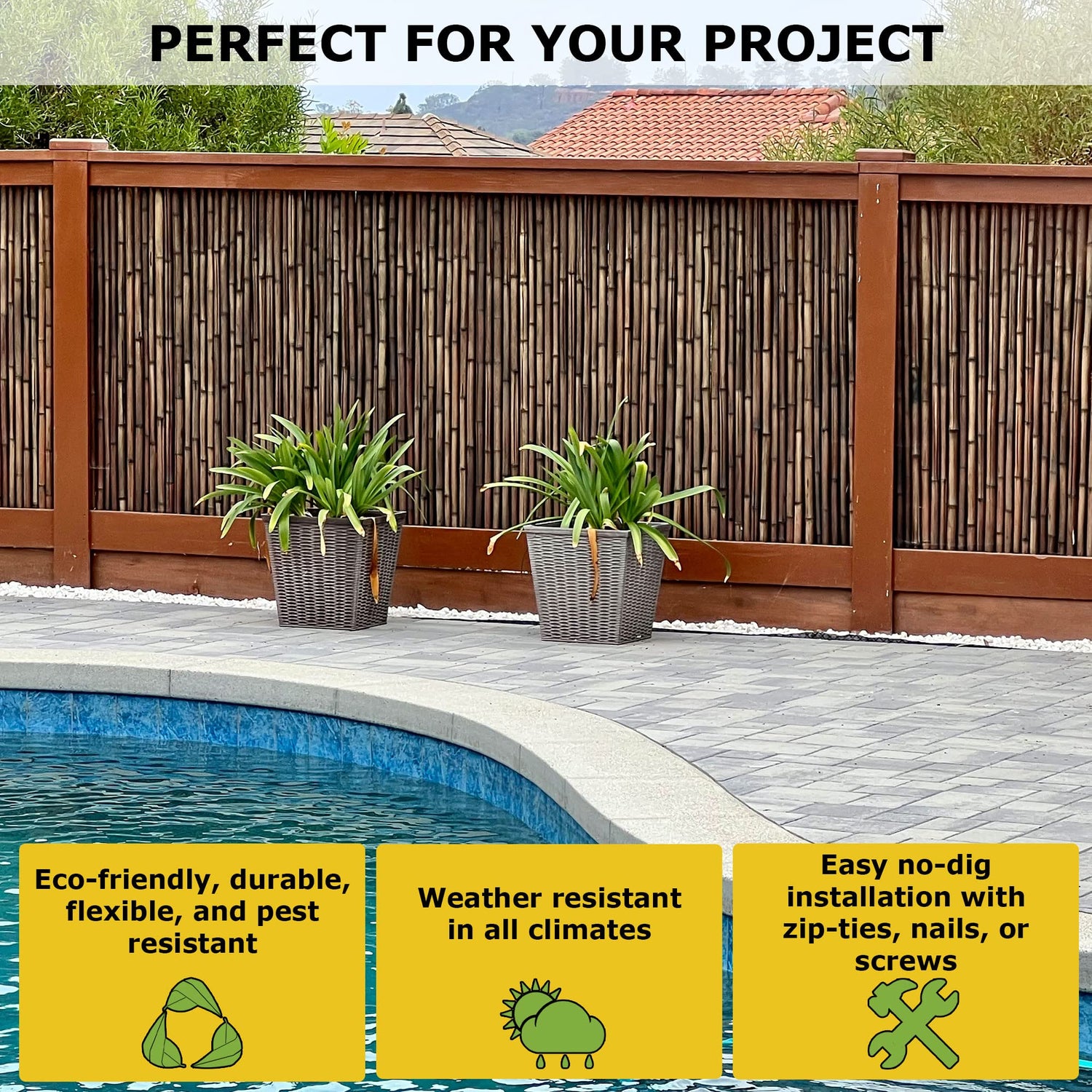 - SUSTAINABLE: Black Bamboo fencing is eco-friendly, affordable, and suitable for indoor and outdoor use. Unlike many conventional building materials, bamboo is 100% renewable.