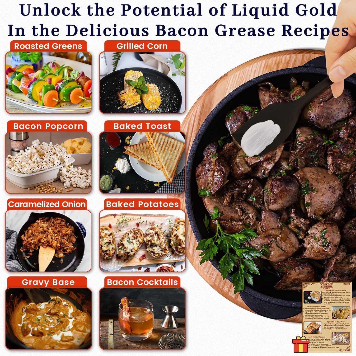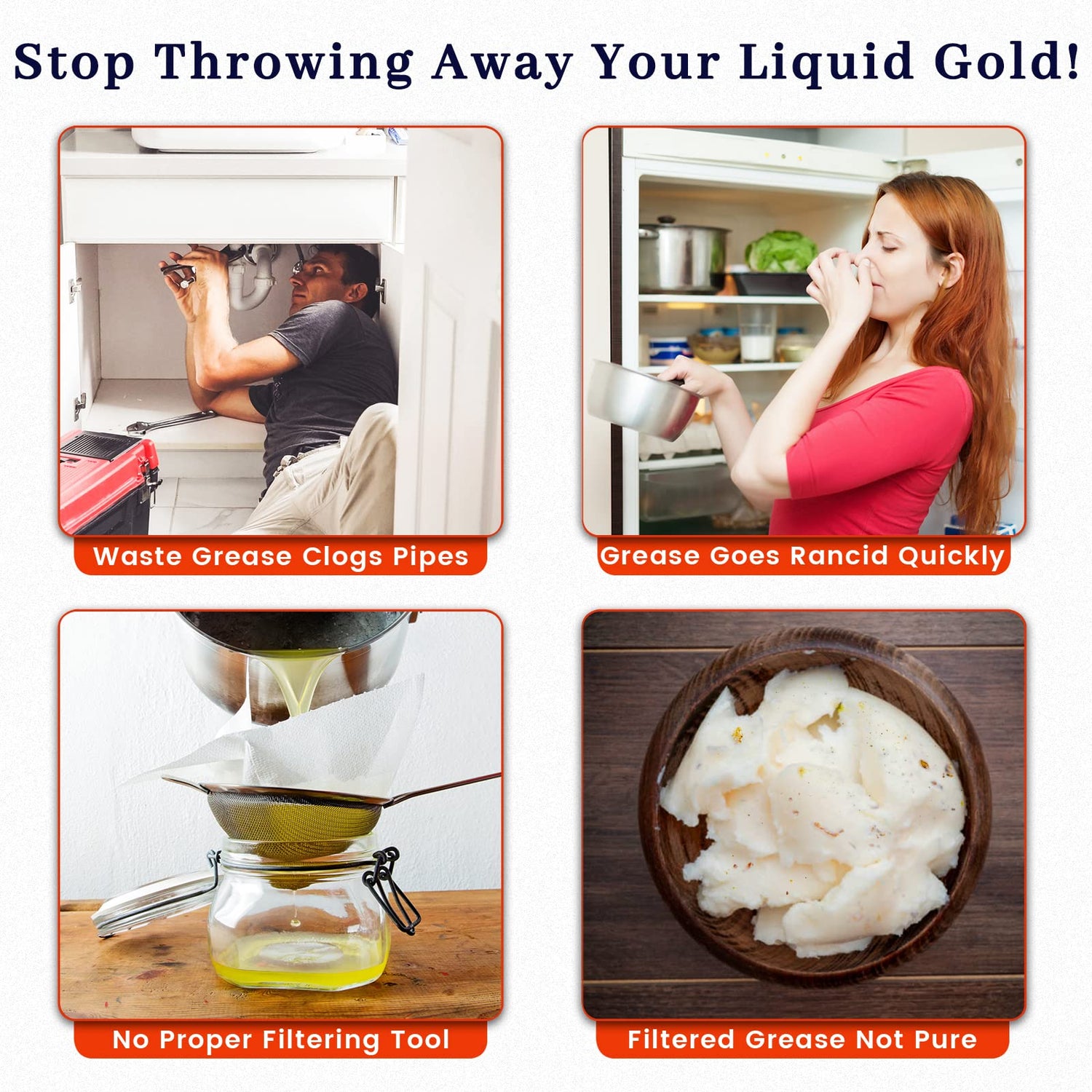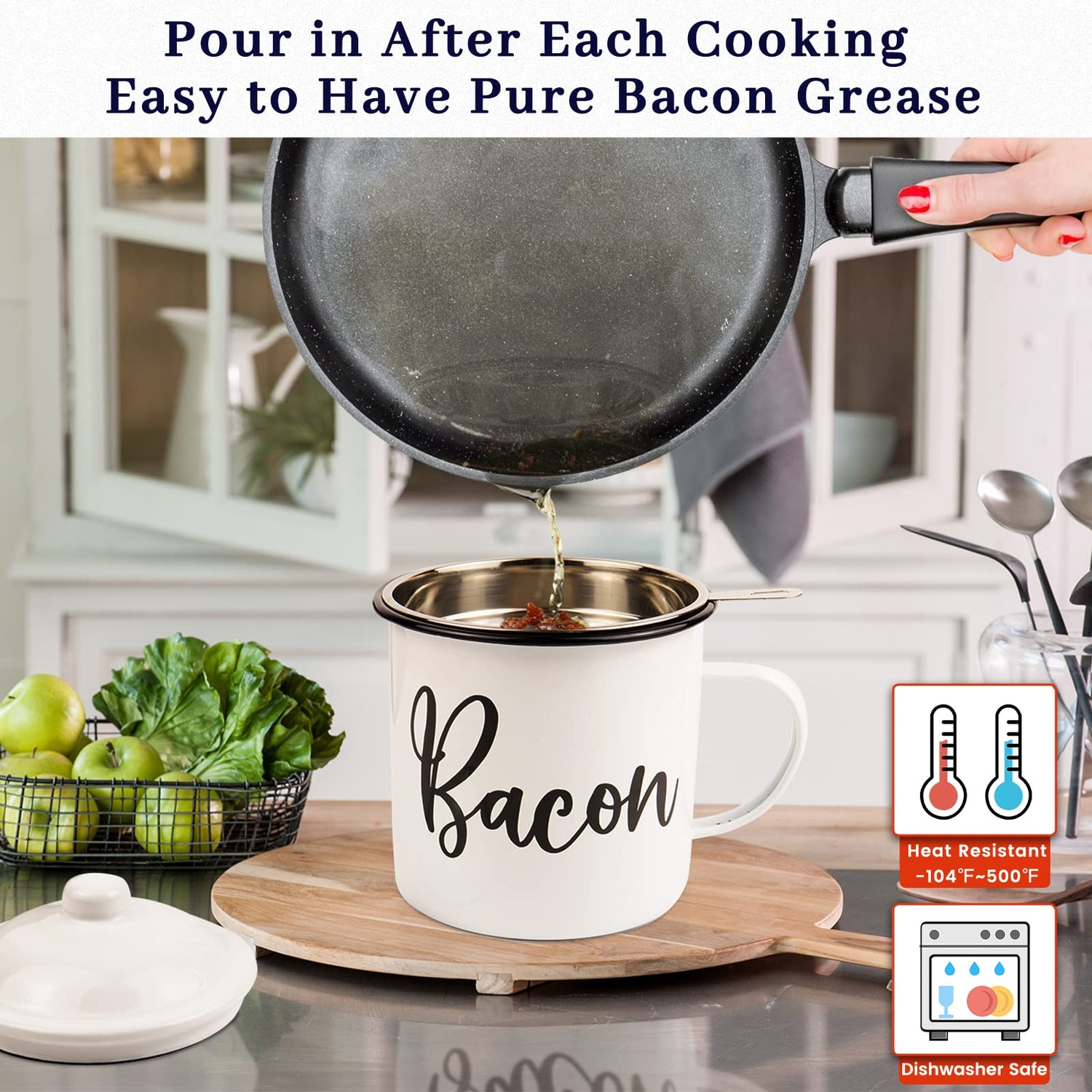 • Stress-Free Cooking: Don't know what to do with bacon grease? Simply pour the remaining grease into this bacon grease container after each cooking, and the fine mesh filter gets clean bacon grease that will give anything a meaty and smoky flavor.