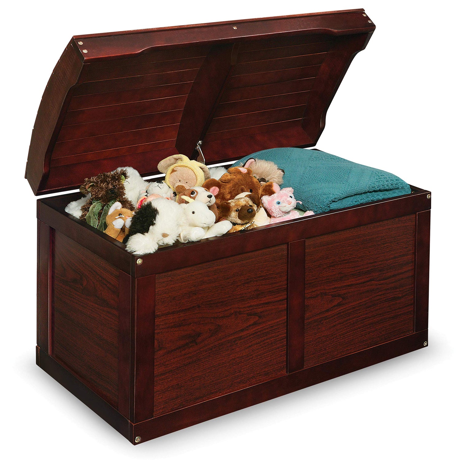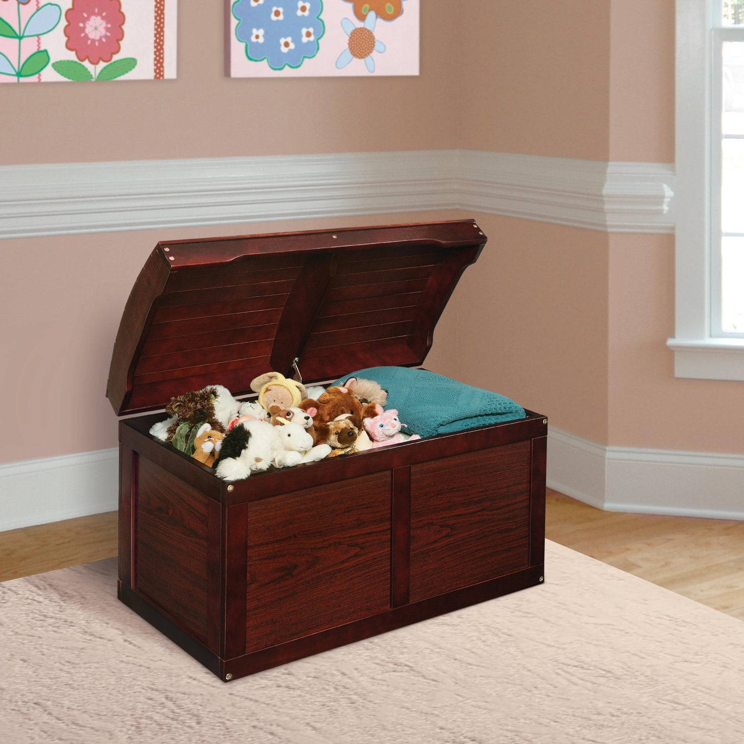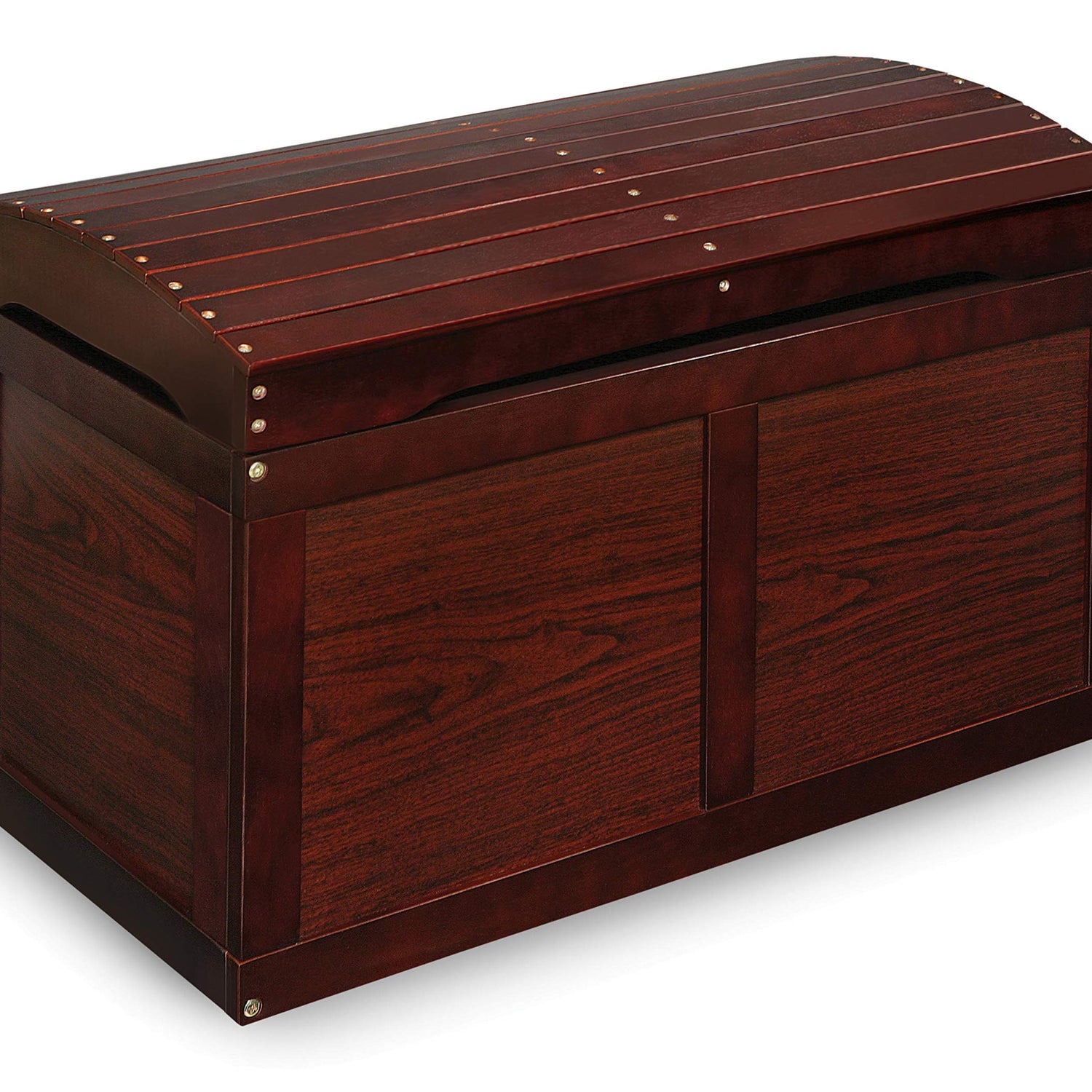 Badger Basket's Barrel Top Toy Chest features attractive styling with a treasure chest look - perfect as a place for storing special toys and stuffed animals. Also great as easily accessible storage for blankets, linens, and bedding! Quality hardware with safety support hinge. Lid opens fully, and stays up in any partially open position. The safety hinge secures the lid in the open position so it will not slam shut on your child while they choose a toy for playtime. Handle slots on front and sides make it comfortable and convenient to open the lid, and prevent fingers from pinching when closing the lid. Built to last for years. Made with solid wood, multi-layer wood, and laminated MDF. Metal hardware and hinges. Overall measurements of 31 inches L x 17 inches W x 19 inches H. Interior dimensions of 29.25 inches L x 15.5 inches D x 13.75 inches H. Inside of lid adds another 1.5 inches to the storage capacity. Assembled weight: 22 pounds. All measurements approximate. Wipe clean with a lightly dampened cloth and mild detergent as needed and dry thoroughly. Adult assembly required. Illustrated assembly instructions included. Non-toxic finish. Product complies with all currently applicable safety standards. Product includes a limited warranty of 30 Days Parts to the original purchaser. Product may vary slightly from shown and described. Props/accessories shown are for illustration purposes only and are not included with the product. Actual color/finish may vary slightly from screen display. This item ships in its original carton that may include a product photo.