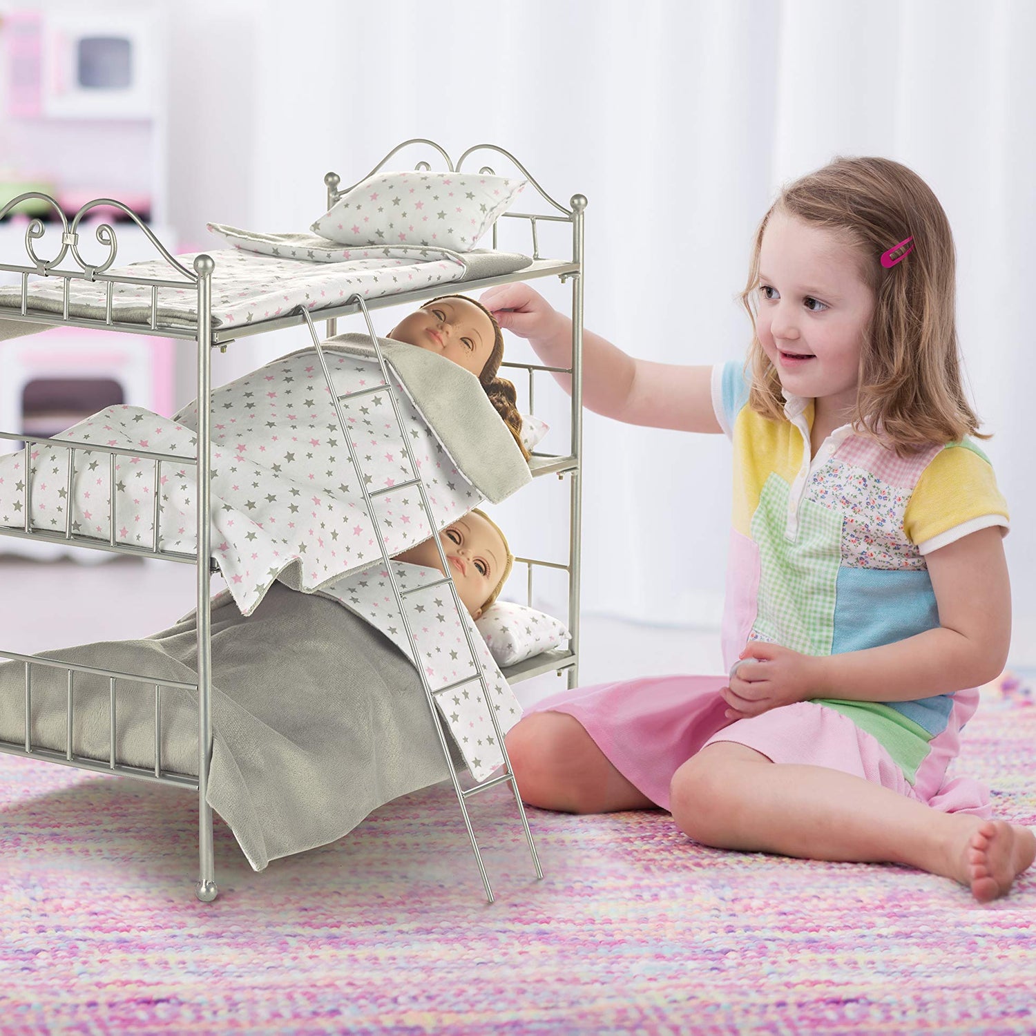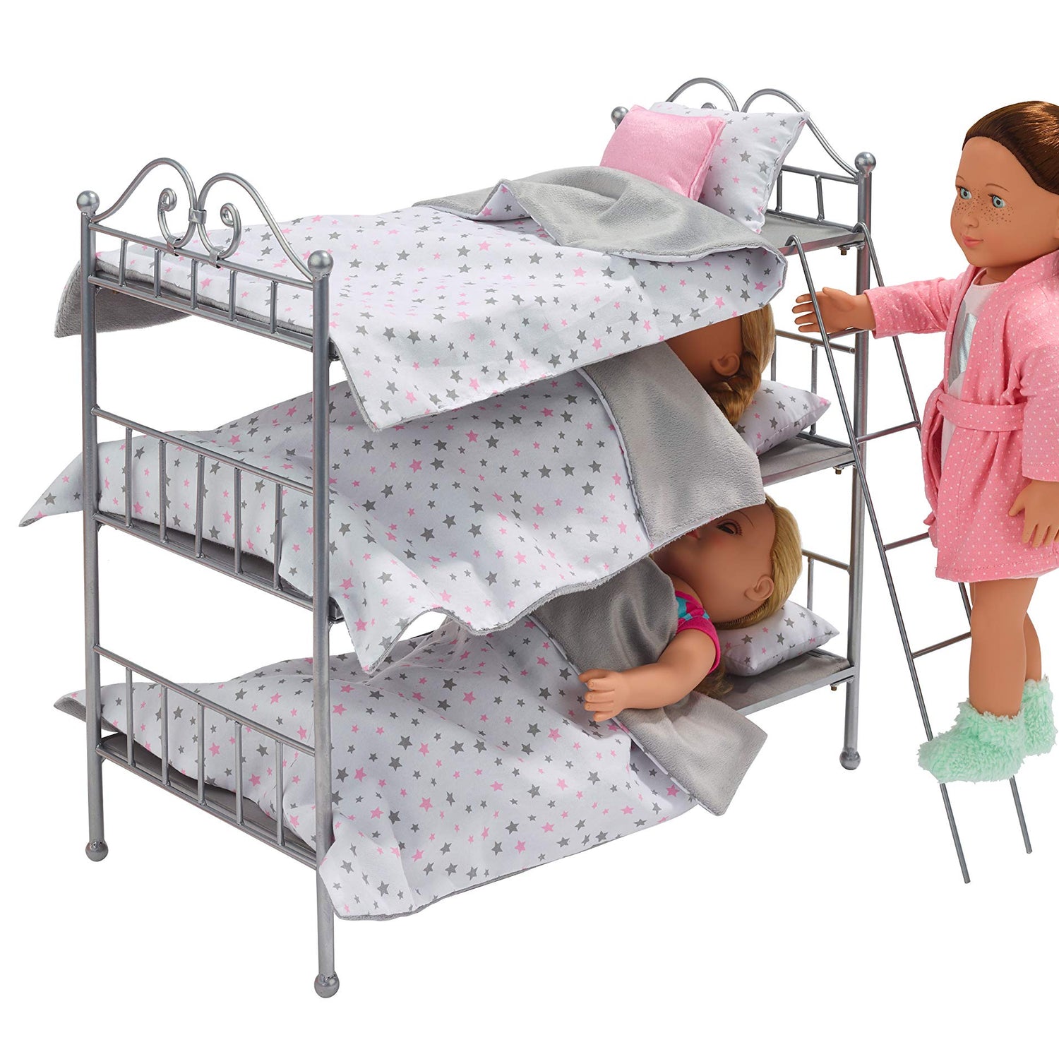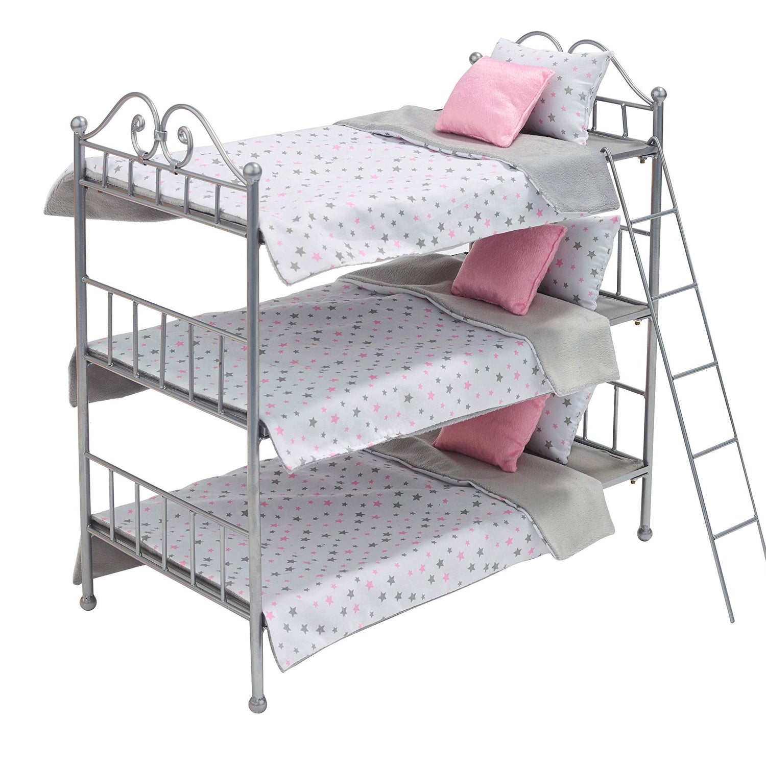 Badger Basket Scrollwork Metal Triple Doll Bunk Bed with Ladder and Bedding – Stylish Silver and Pink Stars Design for 18-Inch Dolls