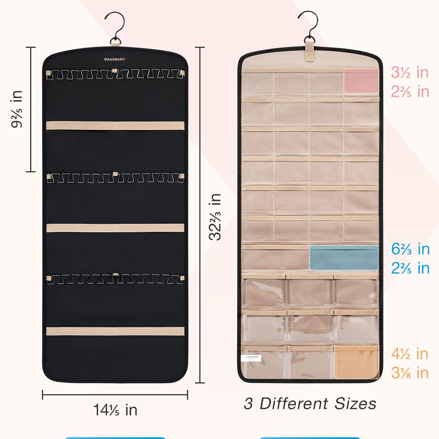 - Multifunctional Storage Bag- Jewlery hanger can also be use as multifunctional hanging storage bag for daily supply and fashion piece, such as smart watch bands, hair accessories,hair ties, nail polishes, makeup, toiletries, crafts, cables, cards, etc. Large Size:14.5'' x 32.66'', weight:0.77lb. The foldable function allows you to fold it into a small pouch for travel