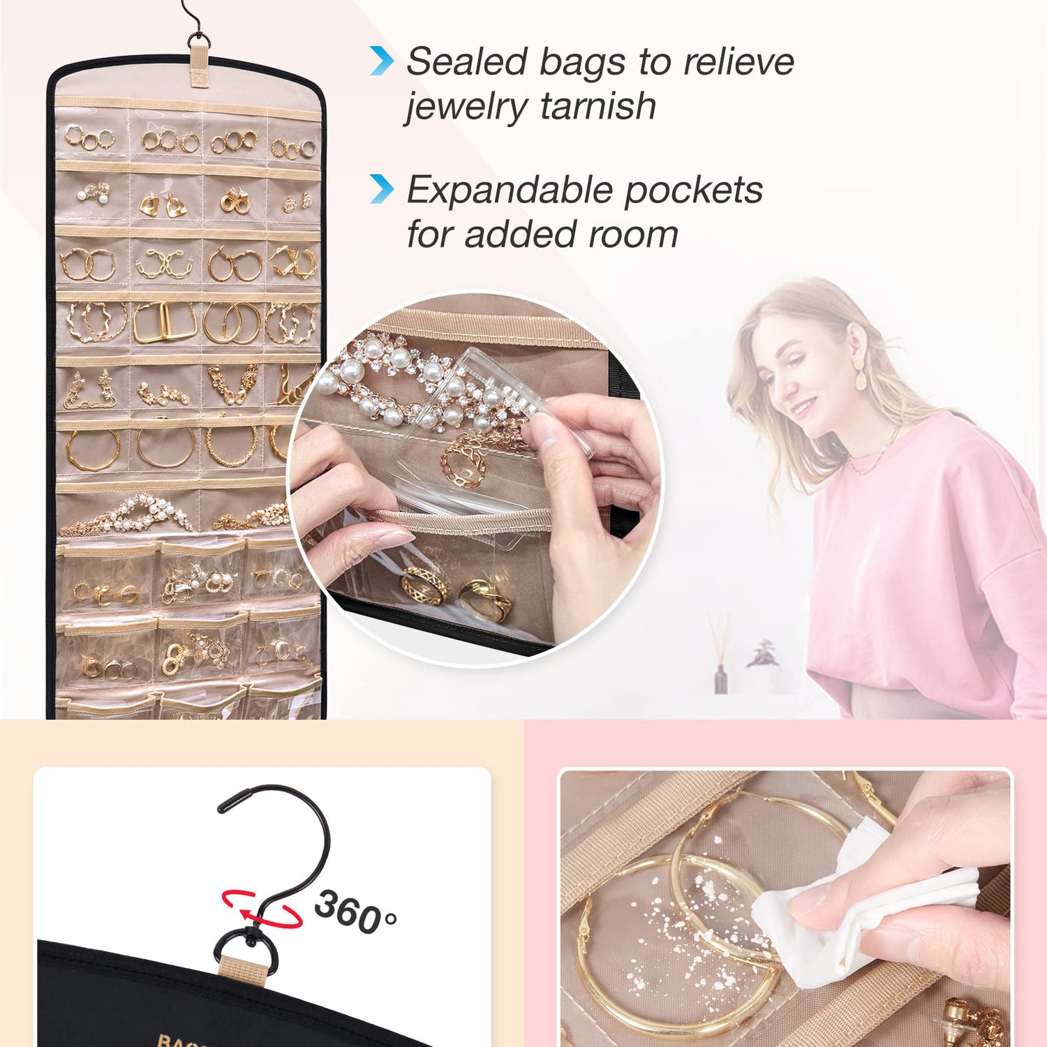 BAGSMART Hanging Jewelry Organizer, Necklace Holder Anti-tangle Earrings Rings Hanger with 20 Jewelry Bags Travel Storage Roll with Pockets Hang on Closet, Wall, Door,1 Piece, Large, Black