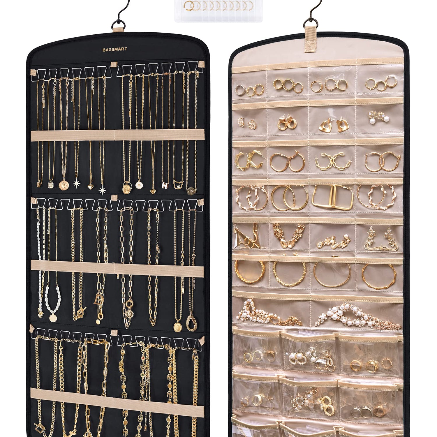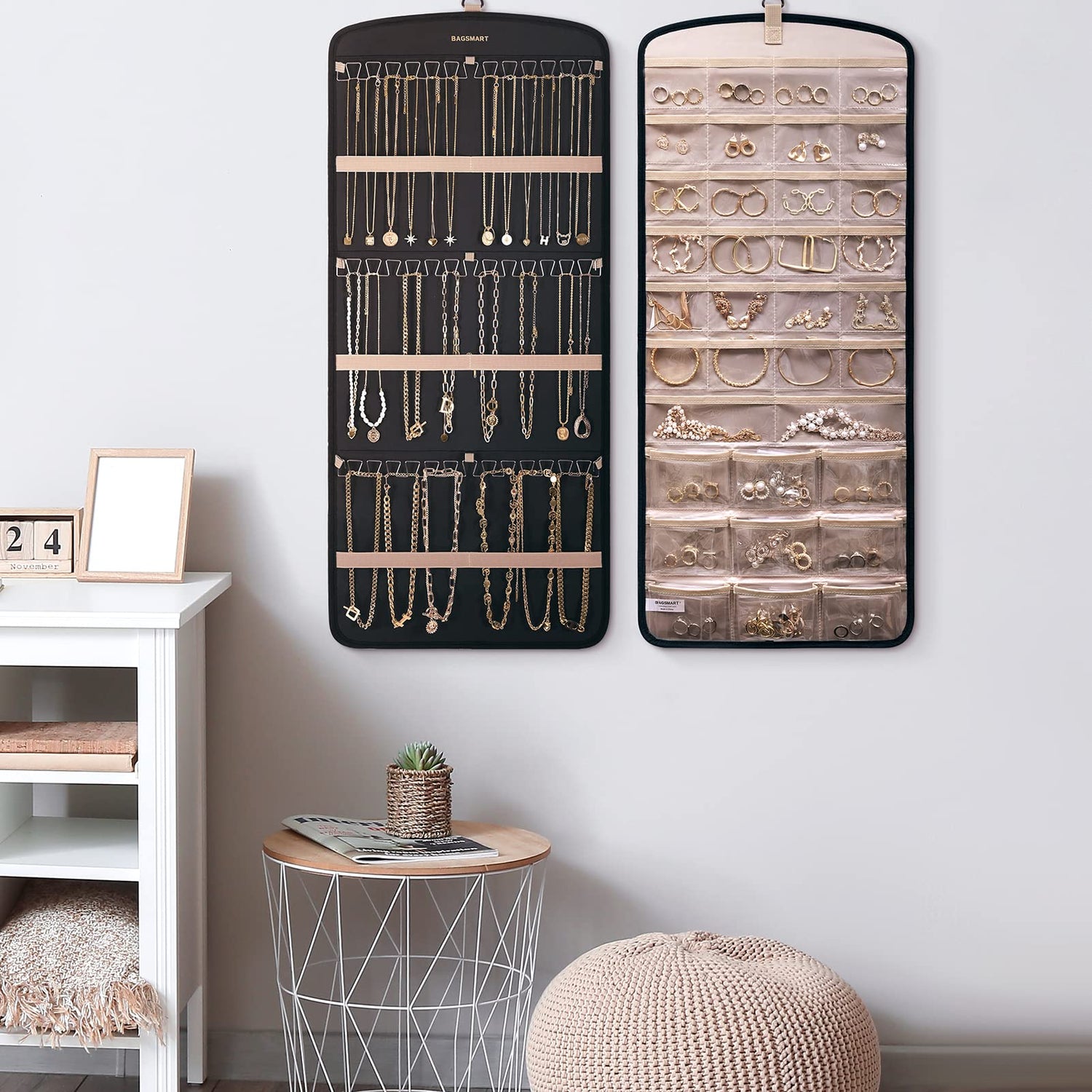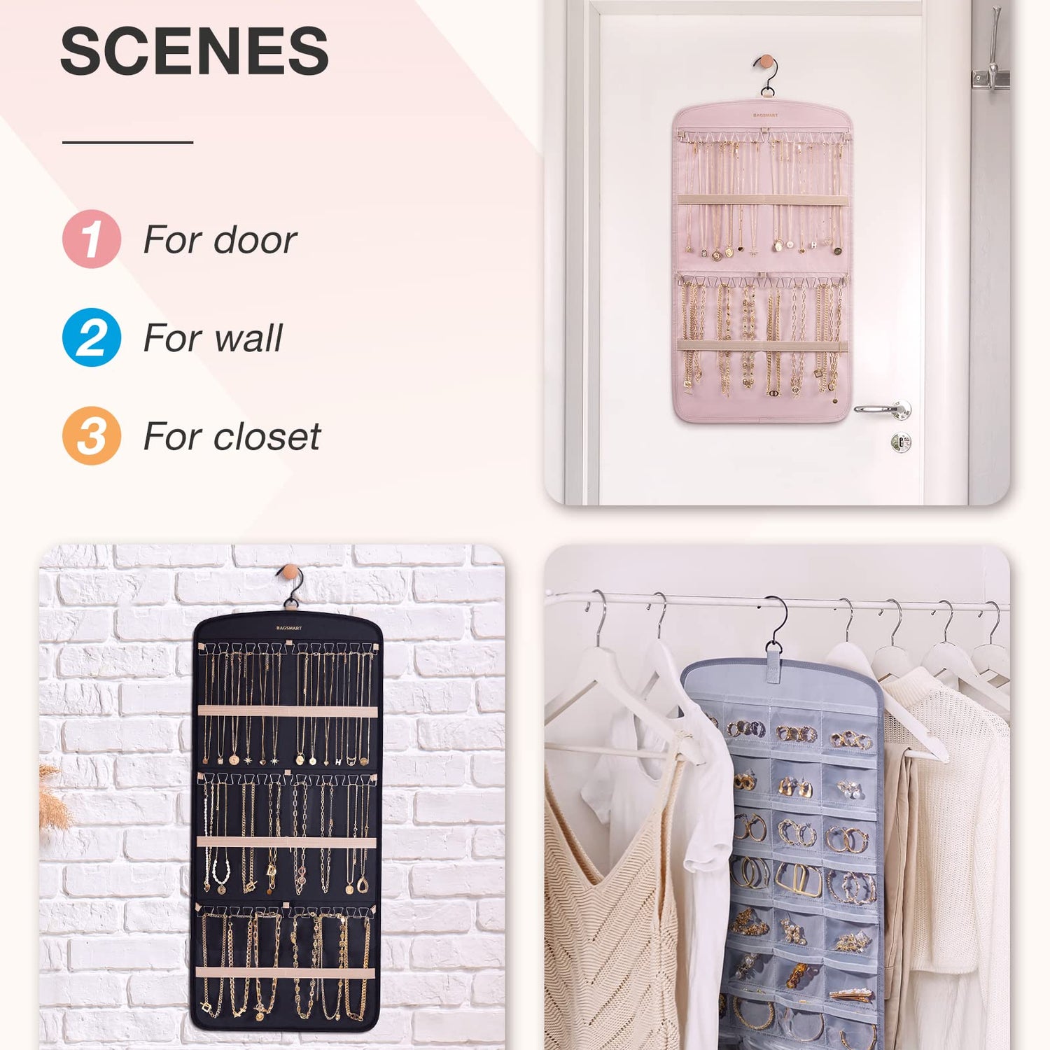 - Perfect Organized Partner- Made of premium polyester, PVC material and strong metal hooks, this jewelry holder organizer features exquisite look with long durability. Two-sided design with 360 degree rotating hanger, making it can be rotated to any direction you need, and easily be hung on closet, door, or wall, takeing up less space than a piece of clothing in your closet