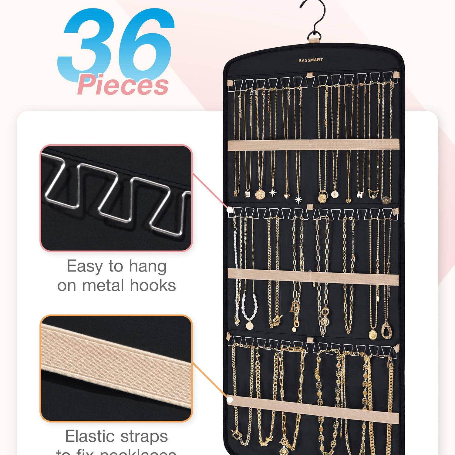 - Thoughtfully Designed Hooks- Necklace organizer comes with 3 rows of sturdy metal hooks offer much easier and faster to access everything. Differ from messy jewelry boxes, superior elastic straps design can keep necklaces separated and untangled.The unique design truly earned the heart of jewelry lover