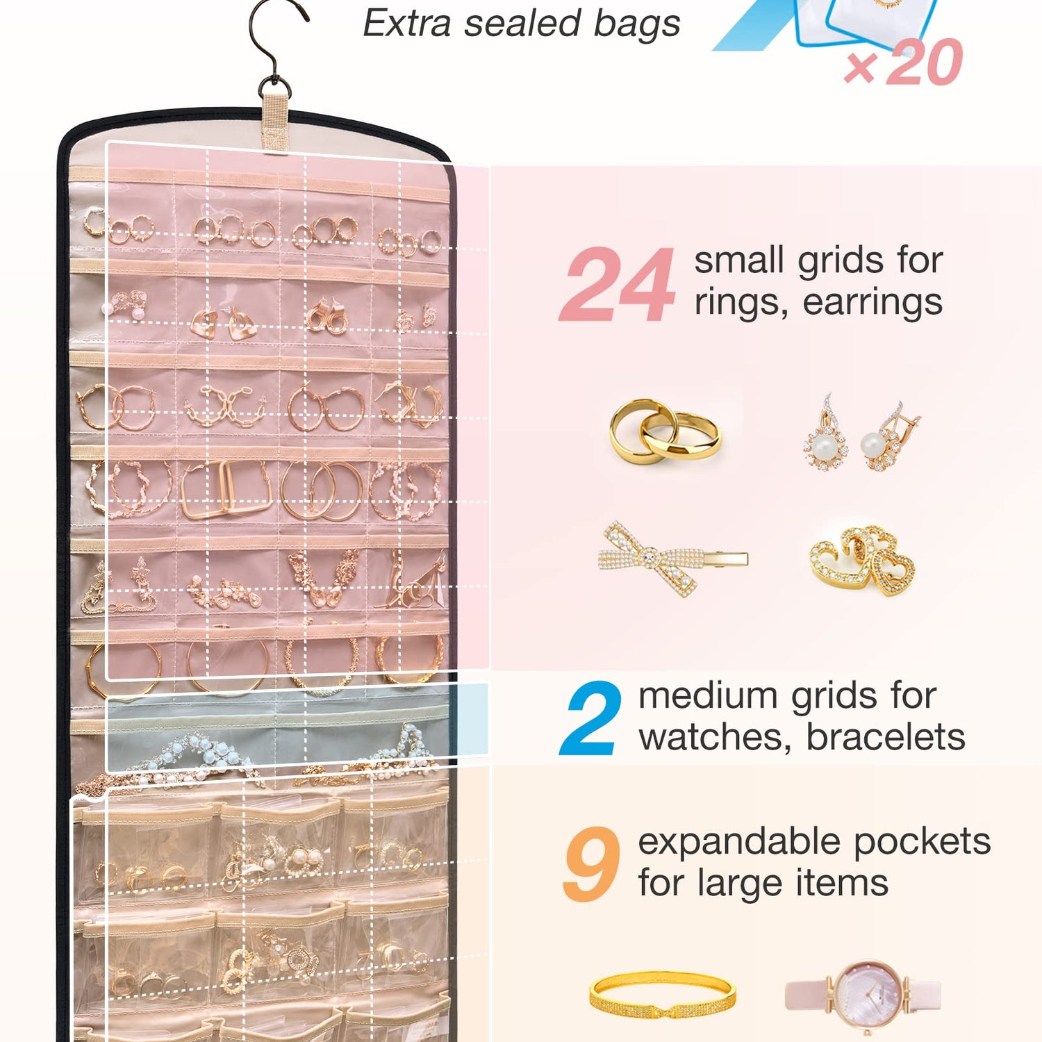 - Roomy Capacity- Dual sided hanging jewelry organizer can storage and display a bulk of jewelry. Complete with 32 transparent pockets and 20 PVC anti-tarnish plastic bags , this jewelry storage can hold your rings, earrings, bracelets, watches, hairpins or other accessory. No more scatter them around. And the other side can accommodate 36 necklaces.