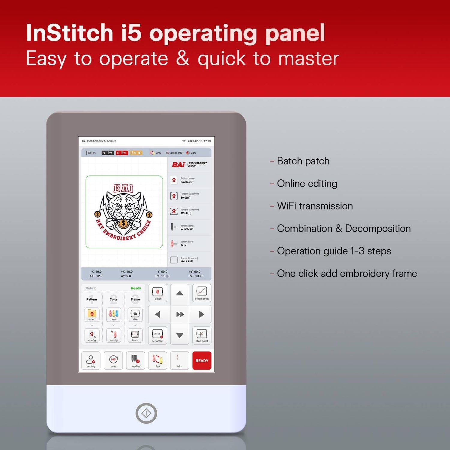- 【Institch I5 Computer System】The newly upgraded electronic control system comes with a 1-3 step operation guidance interface, making the embroidery machine operation learning easier and the response faster.commercial embroidery machine has intelligent 3D hat embroidery, stride jump functions is better at embroidering structural hats.