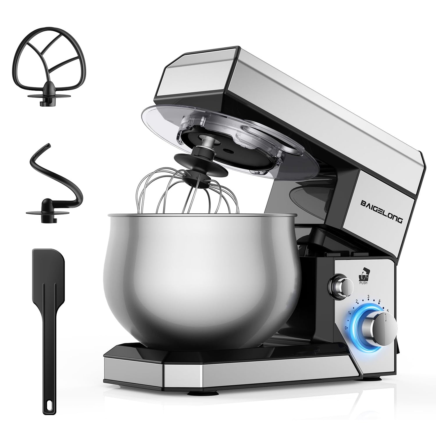 BAIGELONG 6+P Speeds Stand Mixer, 4.2QT Small Food Mixer with Stainless Steel Bowl, Dough Hook, Beater, Whisk & Scraper, Electric Kitchen Mixer Dough Mixer for Baking, Most Home Cooks, Silver