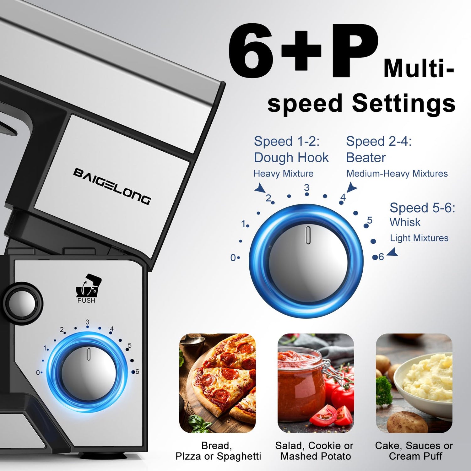 - 【6+P Speed & Powerful Motor】: The stand mixer features a high-performance pure copper motor with 6 refined speed settings and a pulse function. It provides varied mixing strengths from low to high, with pulse capability reaching top speed instantly for quick protein whipping. You can choose the most appropriate mixing intensity for precise control depending on the ingredients and recipe.