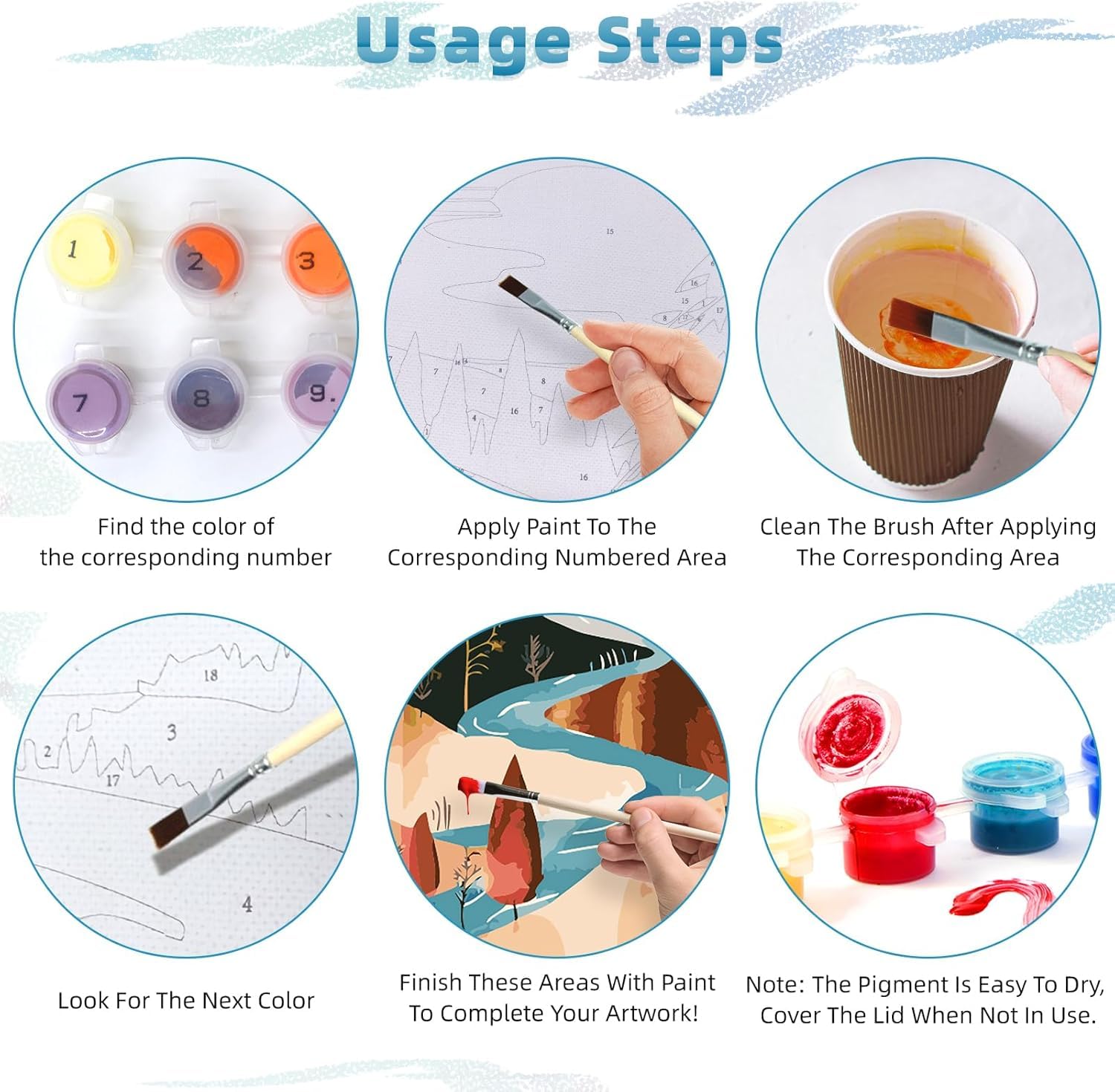 - PACKAGE: It comes with everything you need. Painting by numbers kit include 6 pre-printed textured art canvas (without framed), 18 high-quality paint brushes, matched acrylic paints and nail hooks. Starting painting this PBN painting!