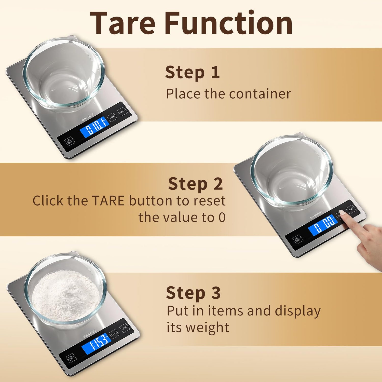 - [ One-Touch Tare ]: This scale comes with la dedicated tare button that instantly resets the display to zero with a single press. Perfect for accurately measuring the net weight of contents in containers or seamlessly adding ingredients in multiple steps