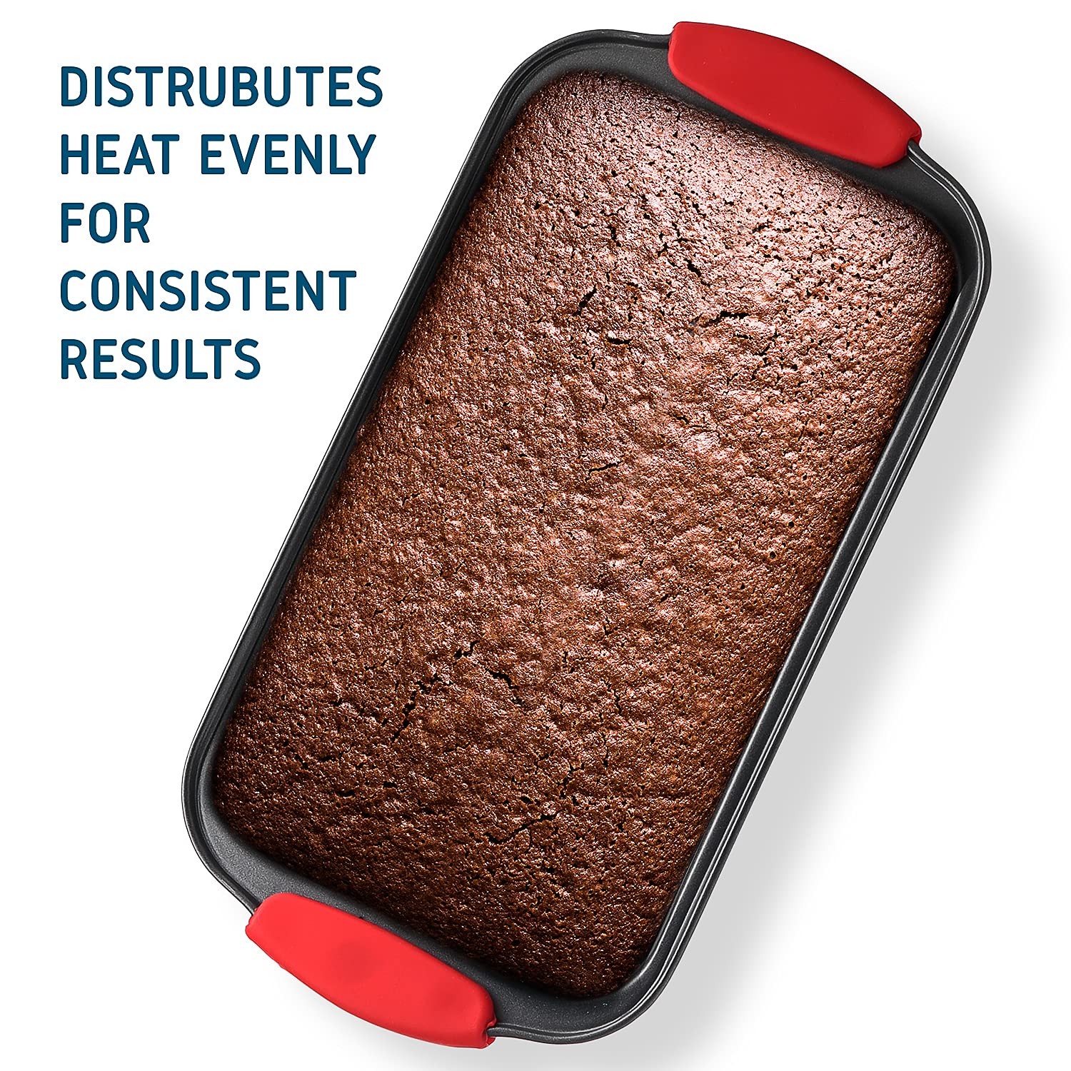 - SILICONE HANDLES: Red silicone grips on our oven pan set ensure a comfortable grasp. Our small, medium, and large cookie sheets for baking, nonstick set is BPA-free and PTFE/PFOA/PFOS-free.
