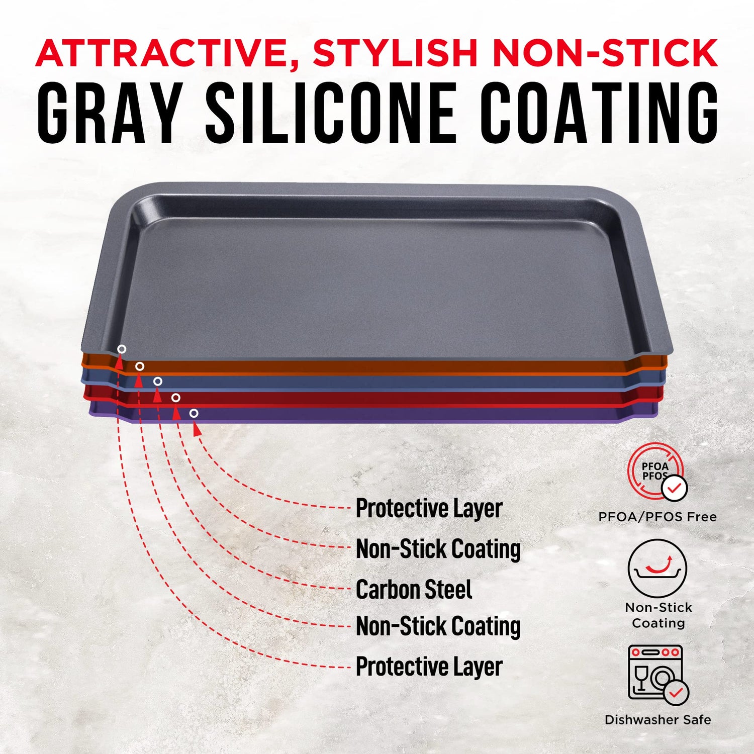 - BAKING SET – upgrade your tired and worn bakeware with our 6 piece set. It is restaurant quality, made from flexible and nonstick carbon steel and is commercial grade to ensure longevity and premium results. For your complete peace of mind, we have ensured that every piece of bakeware is PFOA, PFOS and PTFE free