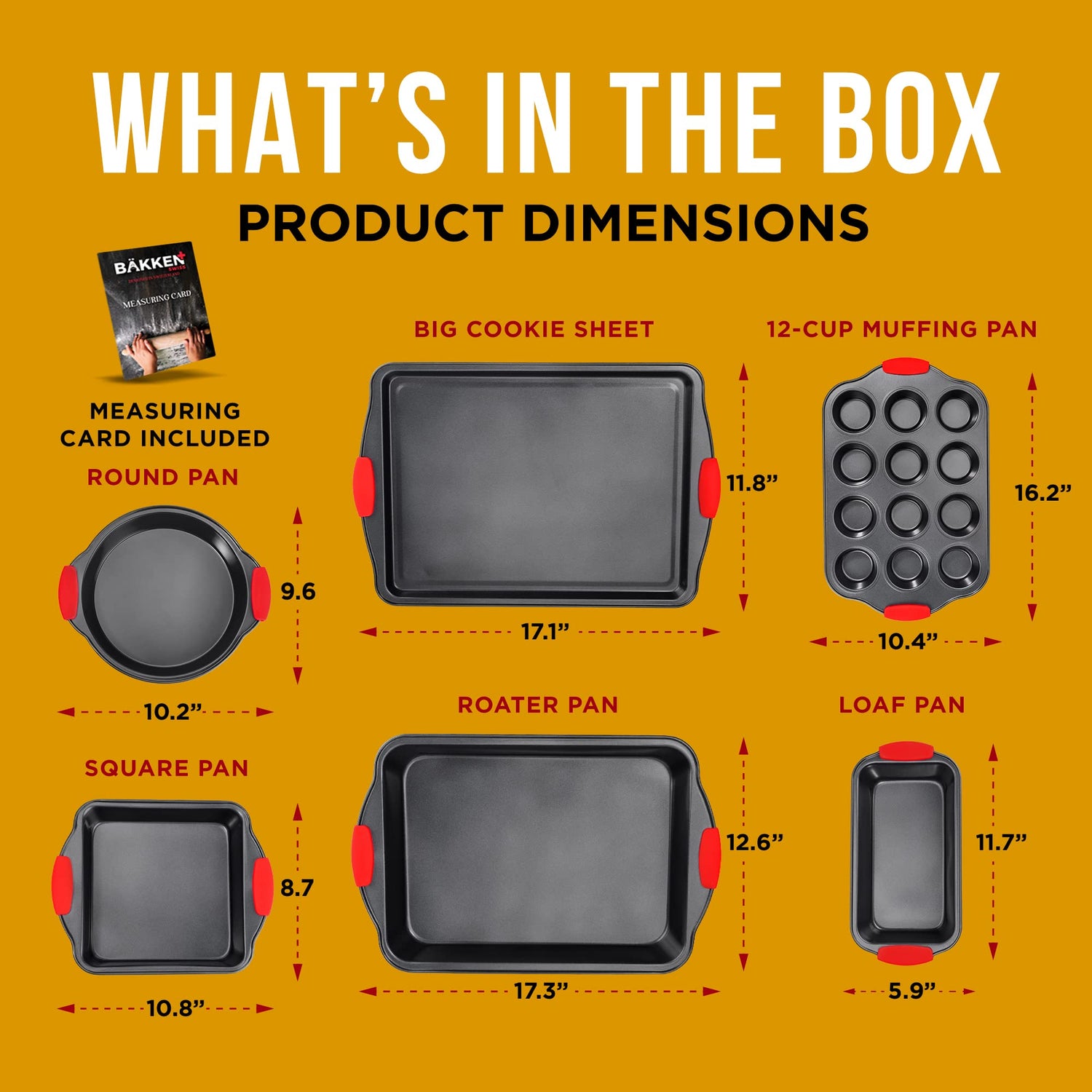 BAKKENMASTER Baking Set – 6 Piece Kitchen Oven Bakeware Set – Deluxe Non-Stick Black Coating Inside and Outside – Carbon Steel – Red Silicone Handles – PFOA PFOS and PTFE Free by Bakken