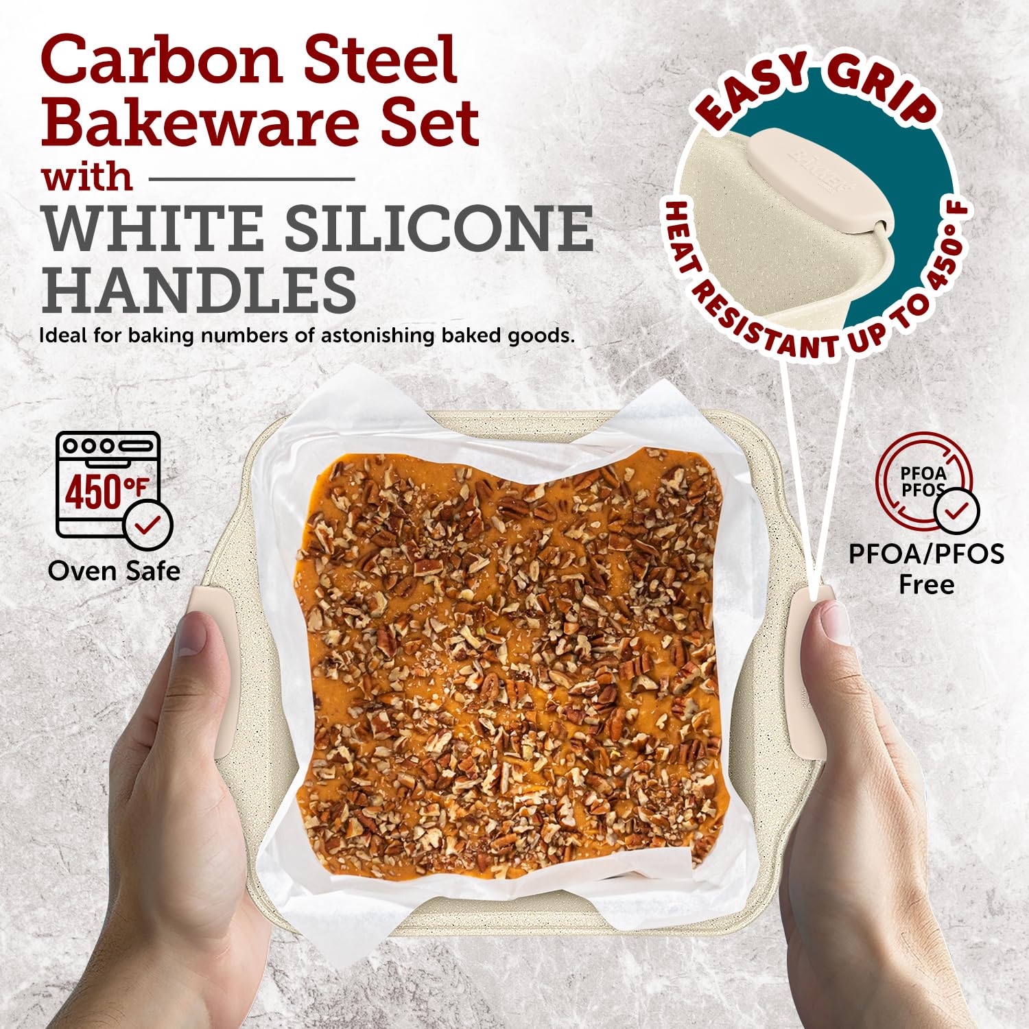 - CONVENIENT HANDLING: Features white silicone handles that stay cool to the touch, allowing for safe and comfortable handling when transferring pans in and out of the oven.