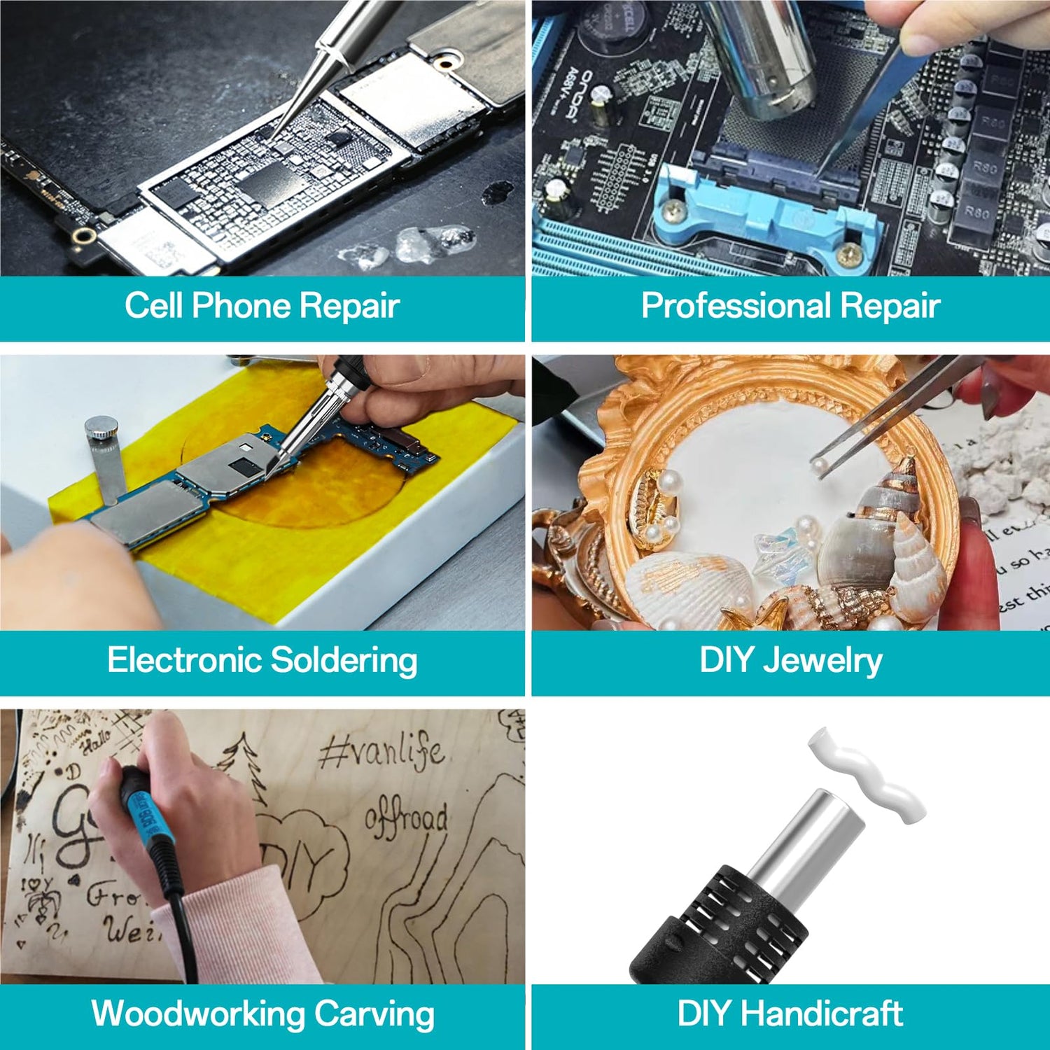 - Soldering Gun: 90 watts of power, fast heat-up, The soldering station has an adjustable temperature range of 100-480°C (212-896°F), which is a wide range of temperatures. Moreover, the soldering gun adopts the PID temperature control technology, which detects the actual temperature of the soldering iron's heating element in real time and quickly corrects it to the correct set temperature to ensure the temperature stabilization, so that you can have a more efficient and smoother soldering/reworking experience.