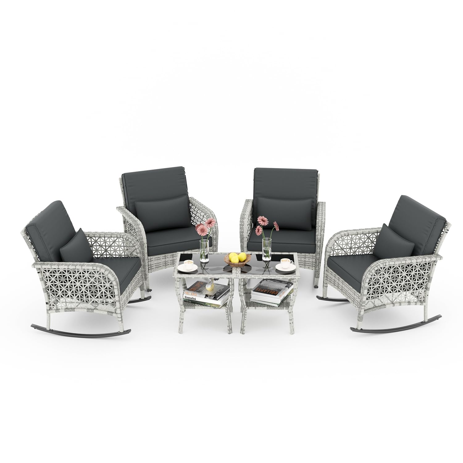 BALDPER 6-Piece Gray Wicker Patio Rocking Chairs Set, Rocking Wicker Bistro Set, Outdoor Furniture Conversation Set with Porch Chairs and Glass Coffee Table, Slate Grey
