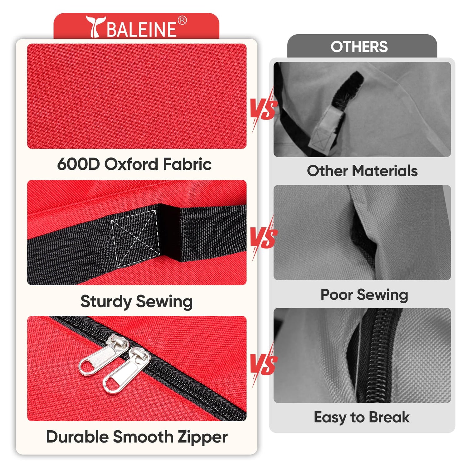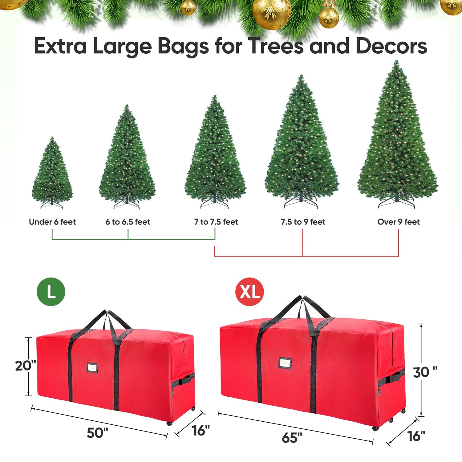 - [SPACIOUS AND VERSATILE] The BALEINE large-sized Christmas tree storage bag measures 50'' x 16'' x 20'', perfect for 7.5 ft disassembled artificial Christmas tree. It also accommodates ornaments, wreaths, lights, and other holiday decorations, ensuring all your festive items are neatly organized in one place.