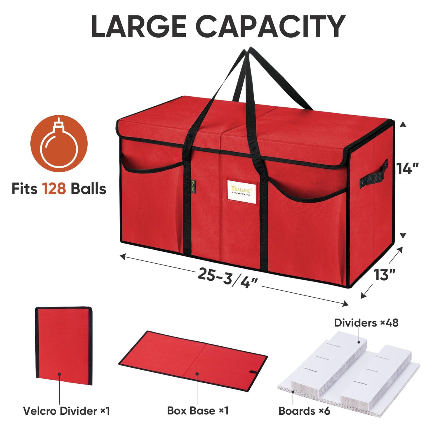 - [LARGE CAPACITY] Christmas storage containers are available in two sizes 13.5''x12.5''x13'' and 26''x12.5''x13.5'', which can hold 64 and 128 Christmas ornaments respectively. There's a clear card slot on the outside for easy identification and organization, and the box can be folded flat easily when not in use.