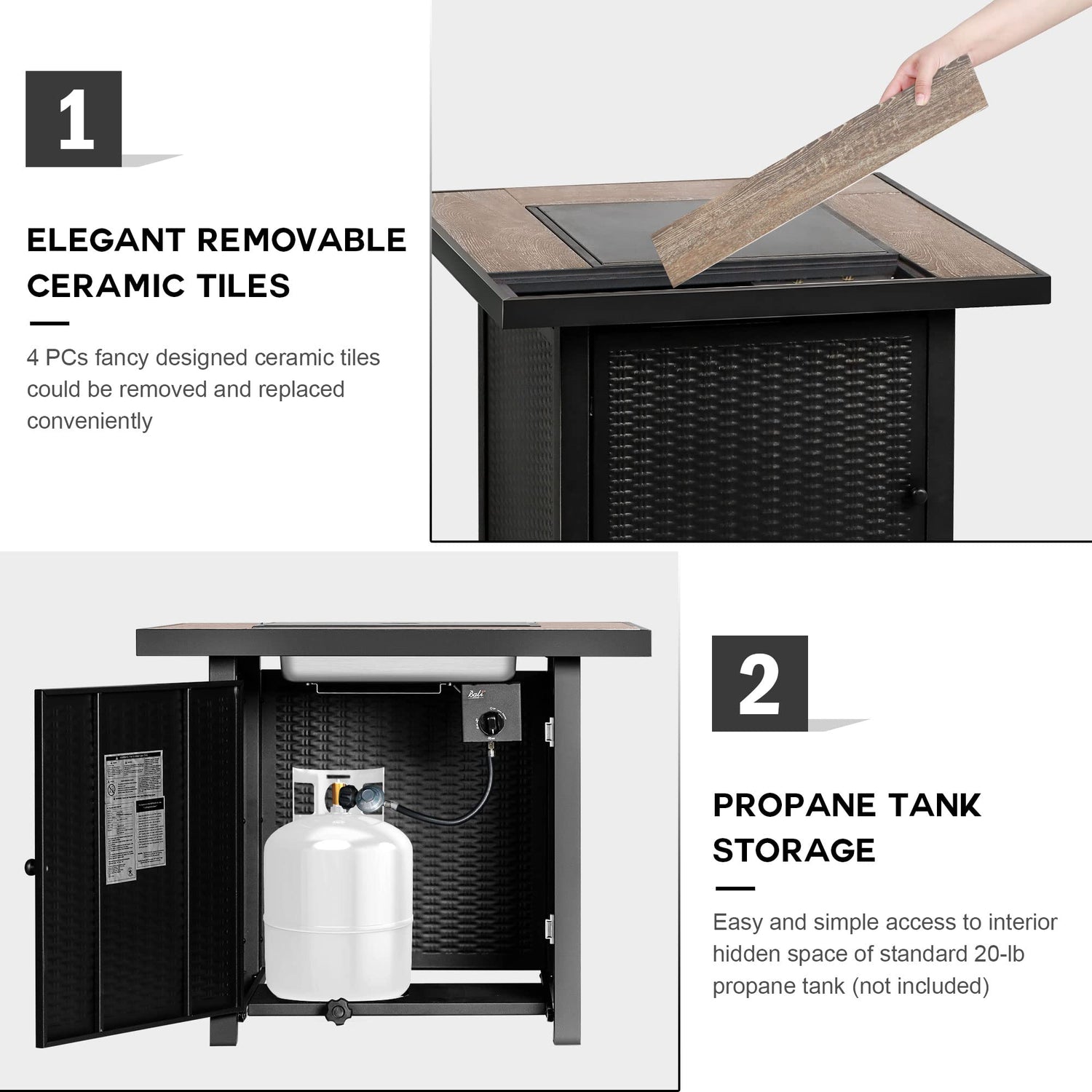 - Modern Style: Glass stones in the propane fire pit create a fascinating effect, reflecting the warm glow of burning fire. Complementing this are four premium tiles that add a beautiful pattern to fire pit table