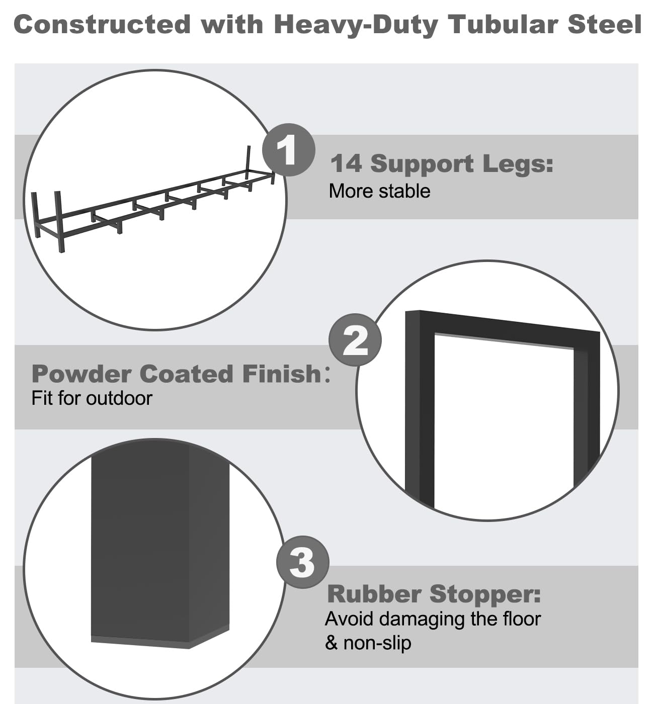 - 14 Support Legs -- Our 8-feet tall wood rack is constructed with heavy-duty tubular steel and features 14 sturdy legs. This design ensures exceptional stability even under heavy loads. Additionally, the rack is coated with a double layer of black powder for long-lasting use both indoors and outdoors.