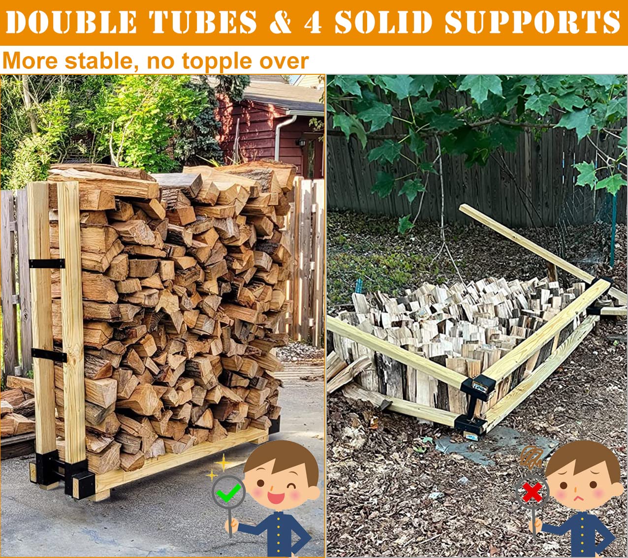 - 【 WIDE USE & WARM TIPS】- Our firewood holder is perfectly use on your home's in-door fireplace or backyard fire pit, outside firepits, burning stove, rick, woodpile and logs for outdoor camping. WARM TIPS that 2x4's should be 1/5 inches exceeded the brackets and ensure the rack works on hard and flat ground. Otherwise, it may cause the rack to tip over.