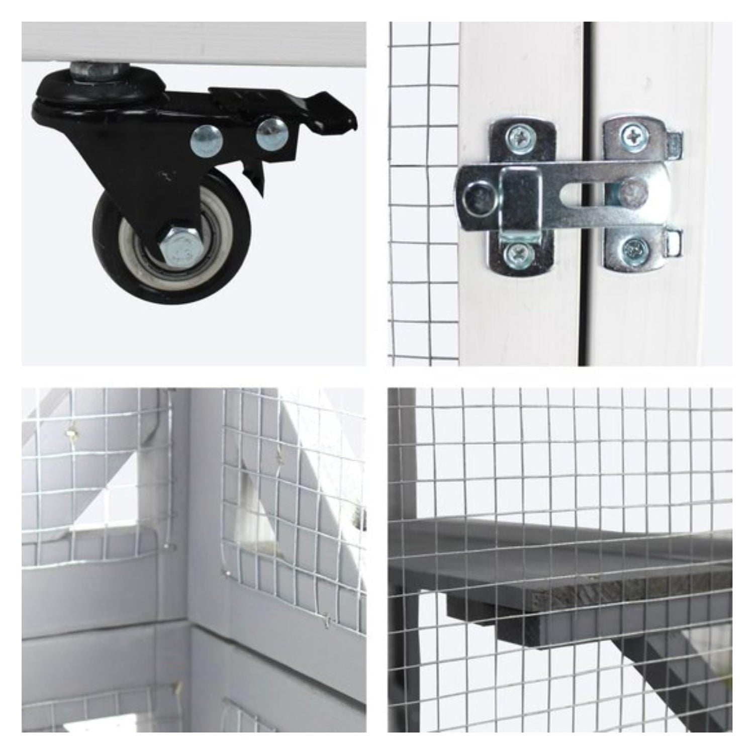Crafted primarily from wood, our cat house exudes a warm and welcoming ambiance, complemented by a sturdy wire mesh enclosure that ensures your cat's activities are always within sight. The spacious interior offers ample room for exercise, play, and relaxation, equipped with two exhilarating platforms for climbing and jumping, and a cozy nook for napping, ensuring your cat's every need is met.