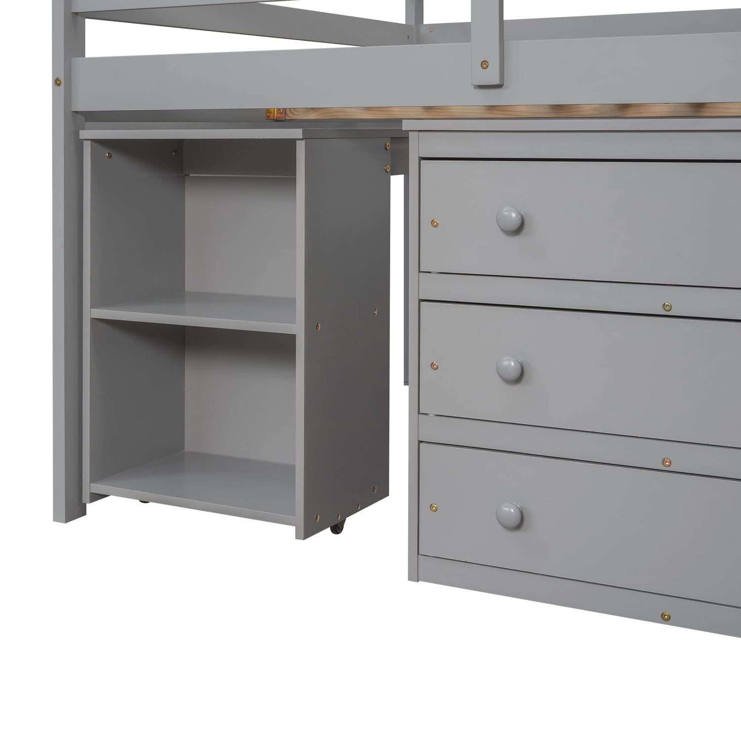Ball & Cast Low Study Full Size Loft Bed with Cabinet and Rolling Portable Desk,Wood Bedframe w/Full-Length Guard Rail & Shelves,Chest of Drawers,Bedroom Furniture for Dorms,Gray