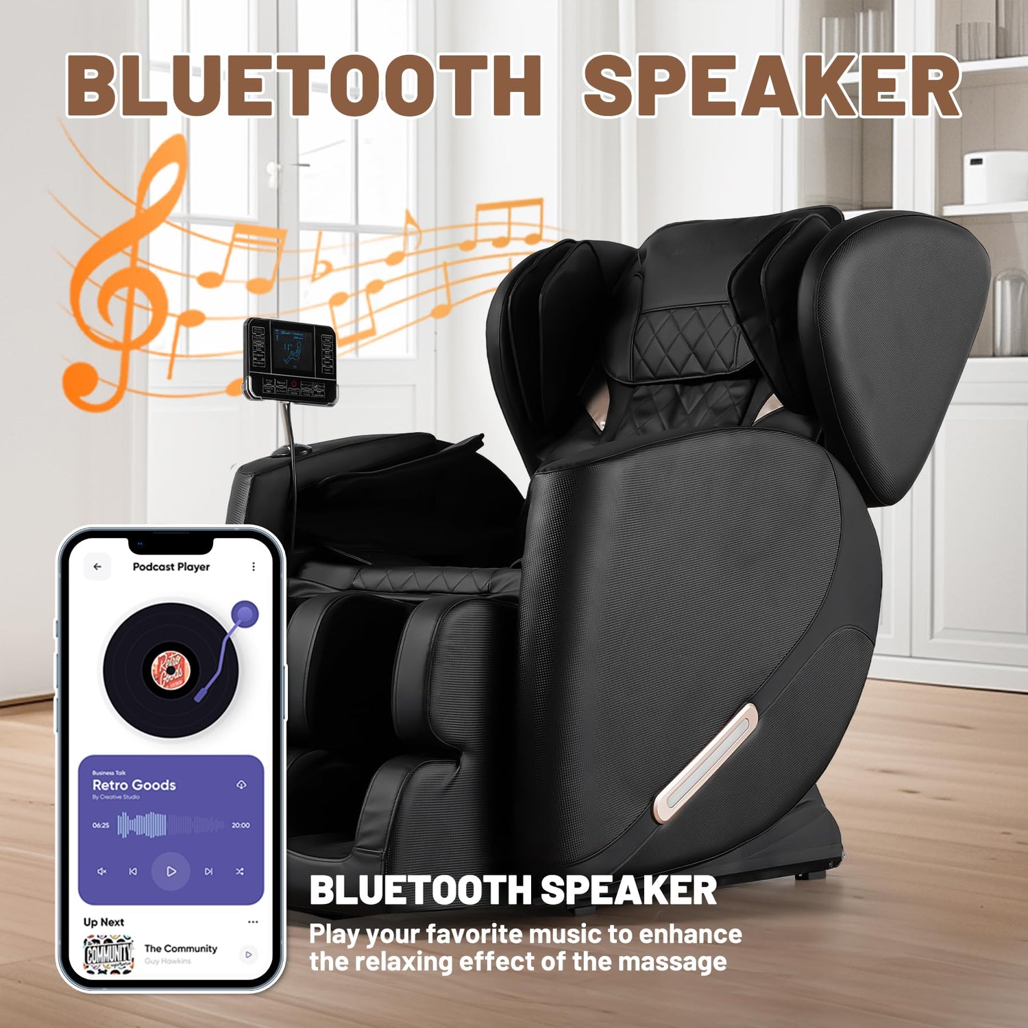 - [Humanized design] The zero gravity massage chair has roller at the bottom so you can easily move around the room. With Bluetooth audio connection function, you can enjoy music while massage. Both sides are equipped with breathing blue atmosphere lights, which can create a comfortable and relaxing environment during the massage. The full body massage chair can accommodate up to 180 pounds and 6.1 feet tall