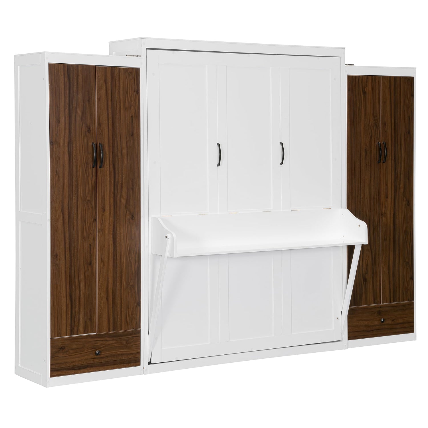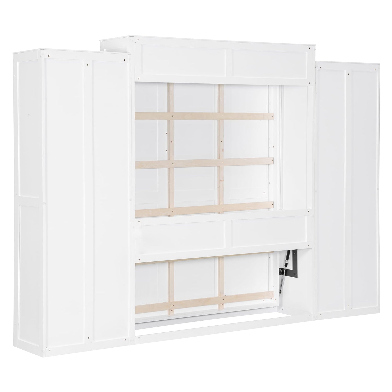 Ball & Cast Murphy Bed Queen Size with Two Side Wardrobes,Hideway Cabinet Bed,Foldable Wall Bed Frame with Led Light,Desk and Drawers for Guest Room,Apartment,Space-Saving,No Box Spring Needed,White