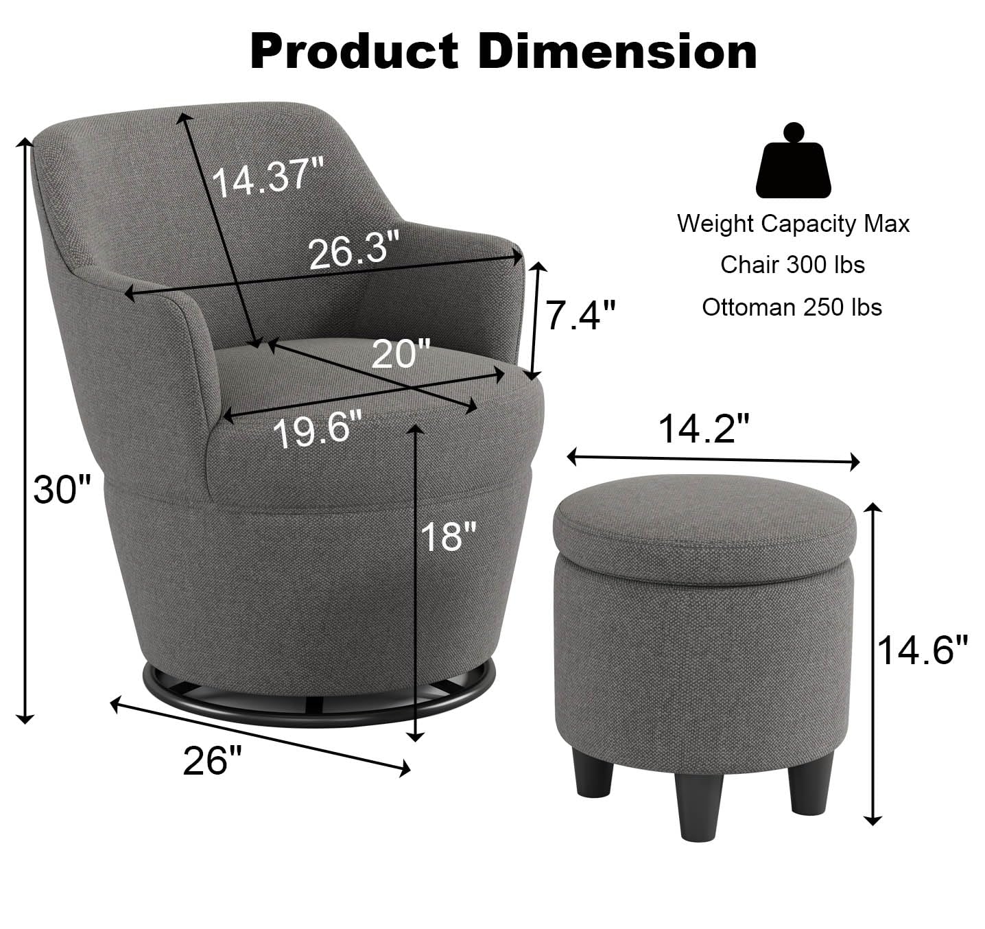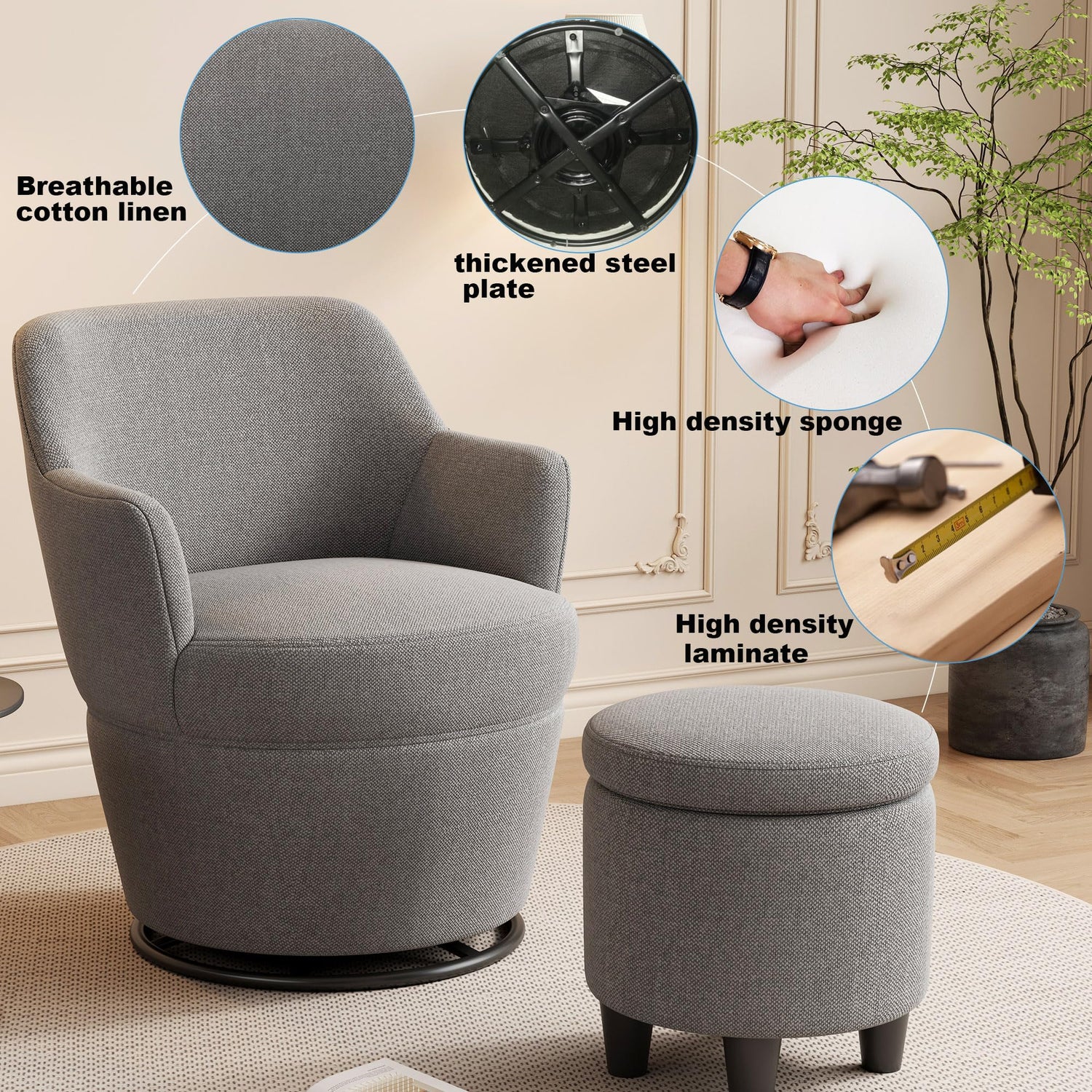 Ball & Cast Swivel Accent Arm Chair with Storage Ottoman, 360°-Swivel Barrel Chair and Footstool, Backrest Recliner Chair w/Ottoman, High Back Linen Single Sofa Side-Chair Stool w/Tray, Grey