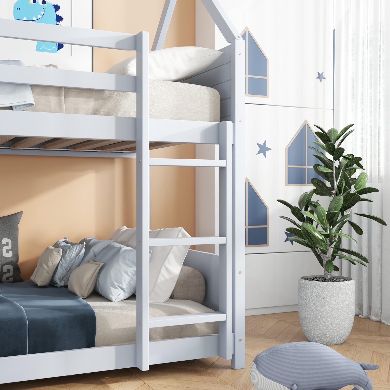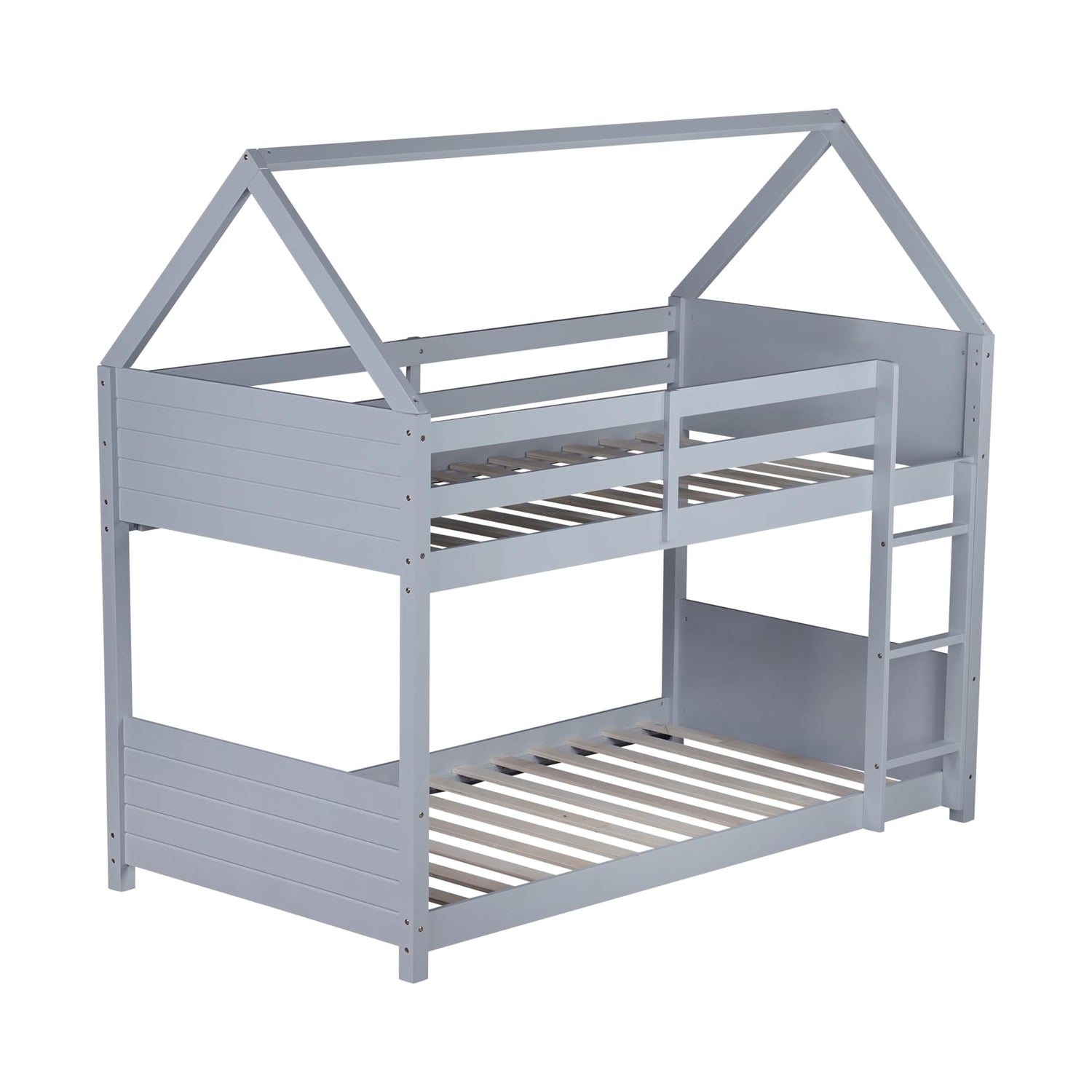 Ball & Cast Twin Over Twin House Bunk Bed for Kids,Rubber Wood Bunk Bed with Headboards, Footboards and Guardrails, Ladder,Twin Size House Shaped Bunk-Bed, No Box Spring Needed,Gray