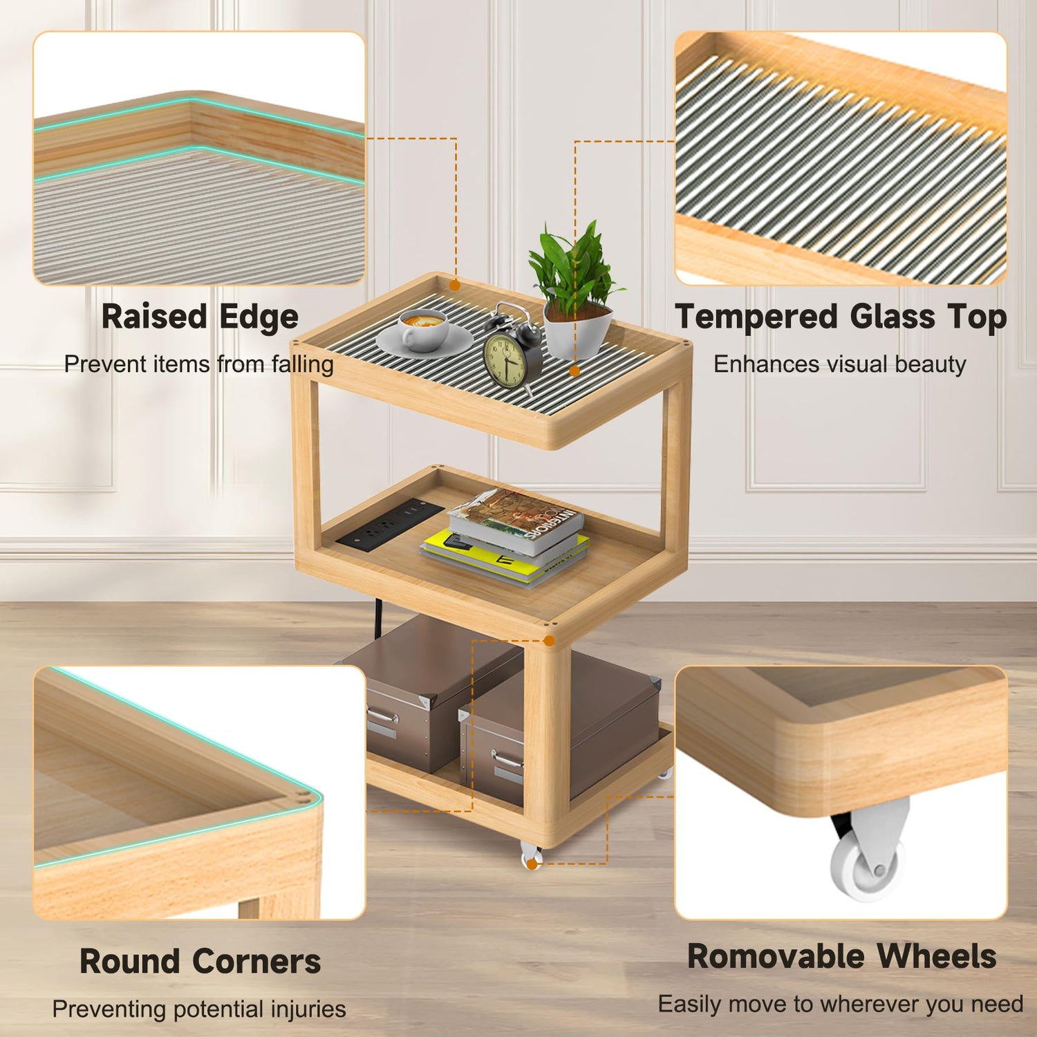 Bamboo Bed Side Table with Charging Station, Modern Boho Bedroom Nightstand with Tempered Glass Top, S Shape 3 Tier End Table Sofa Side Table with Wheels for Living Room, Bedroom, Easy Assembly
