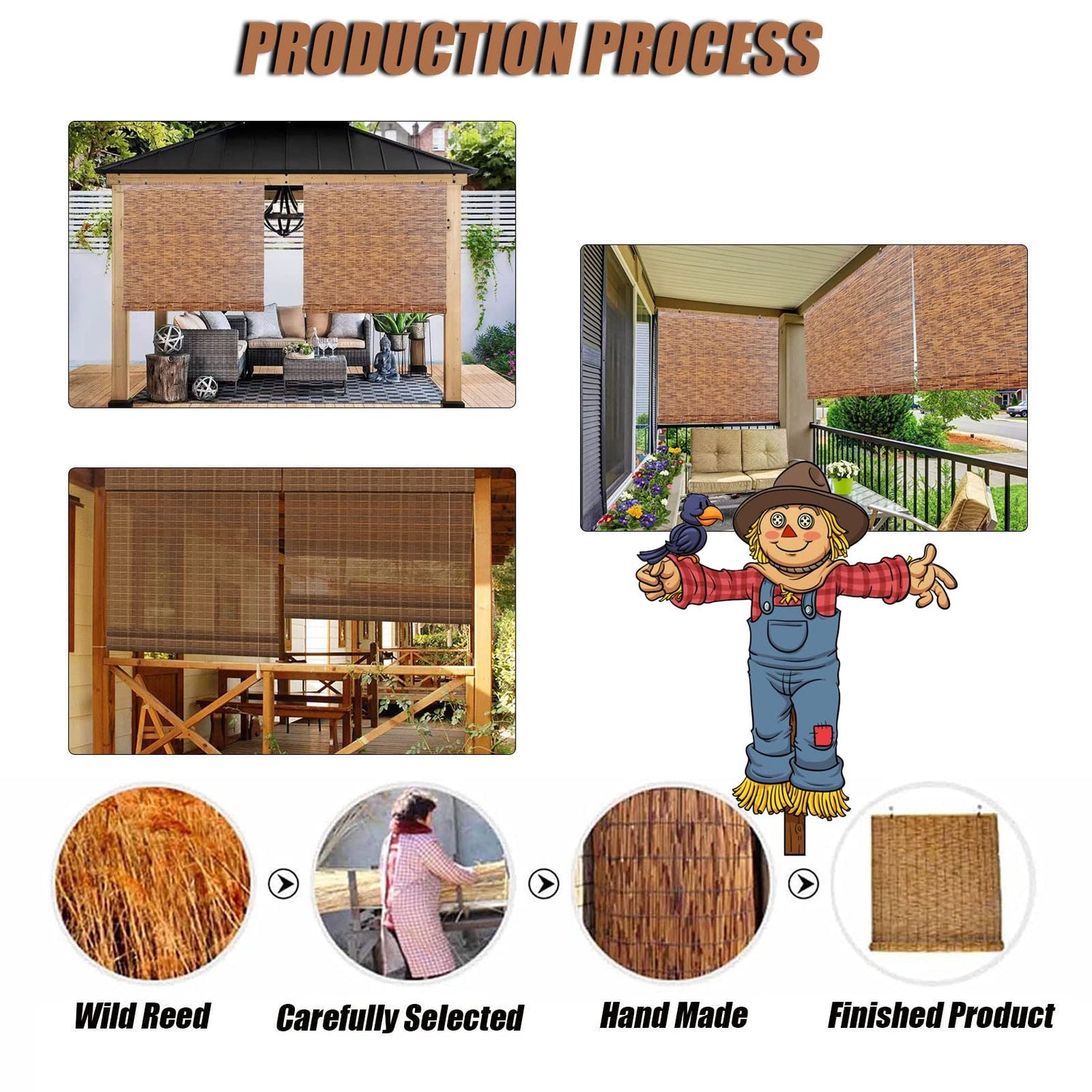- [Very Versatile] The bamboo outdoor blinds for patio roll up can be easily matched with different styles such as traditional, casual and modern. Balconies, tea rooms, hotels, offices, restaurants, partitions, background walls, roofs, resorts, outdoor leisure places, gardens, outdoor areas, carports, pavilions, etc.