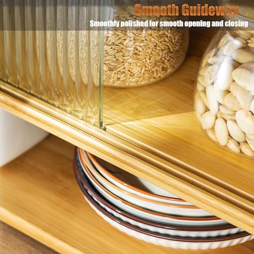 Bamboo Countertop Storage Cabinet with 2 Sliding Striped Glass Doors, Kitchen Cabinet Pantry Sideboard Freestanding Utility Cupboard for Spice Seasoning Bottles, Dish, Bowl (Wood Color)
