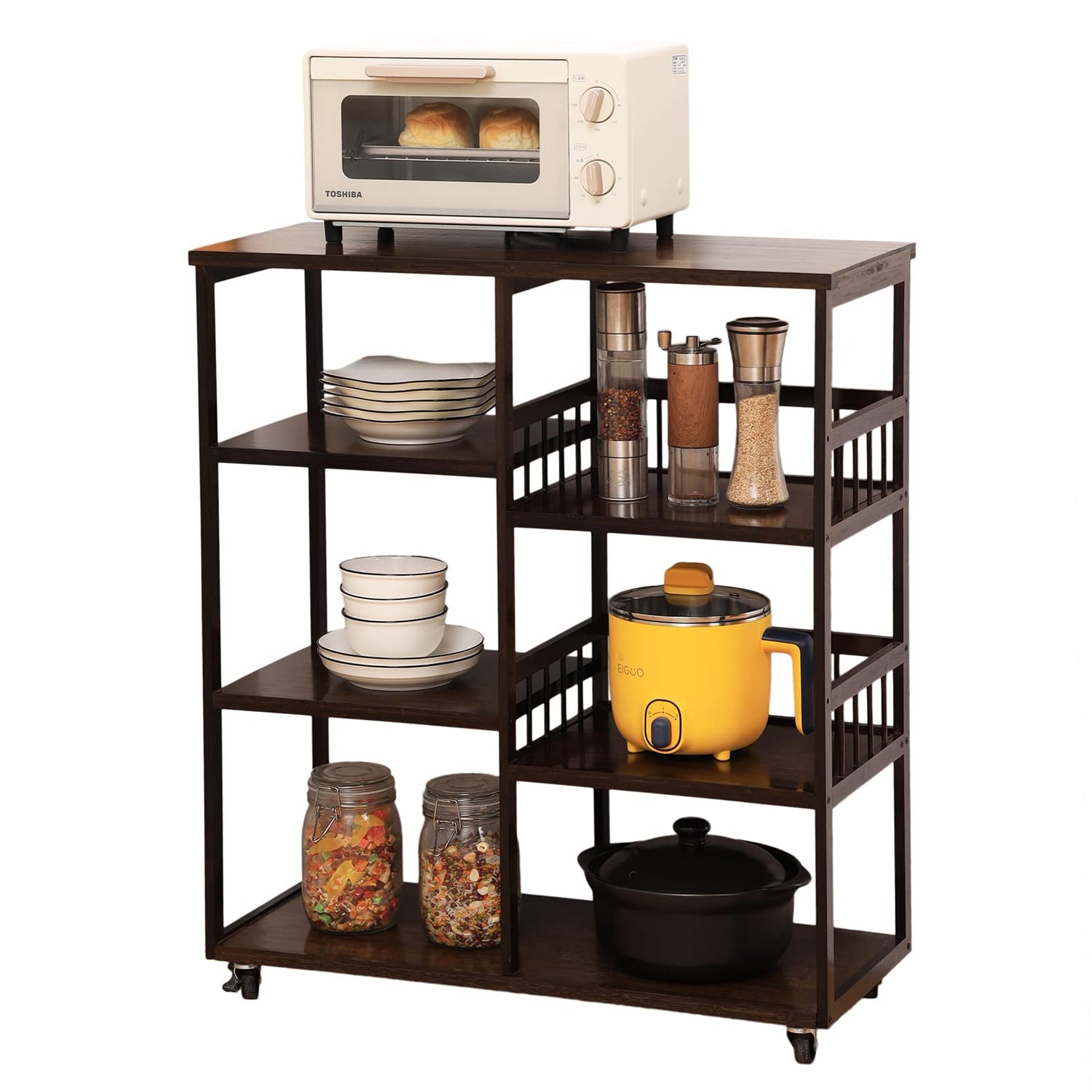 - Large Storage Space Baker’s Rack - 4-Tier+4-Tier shelves can can reliably accommodates microwave oven, toaster, coffee maker or other kitchen appliances ; Fence design makes this coffee table more beautiful and safe