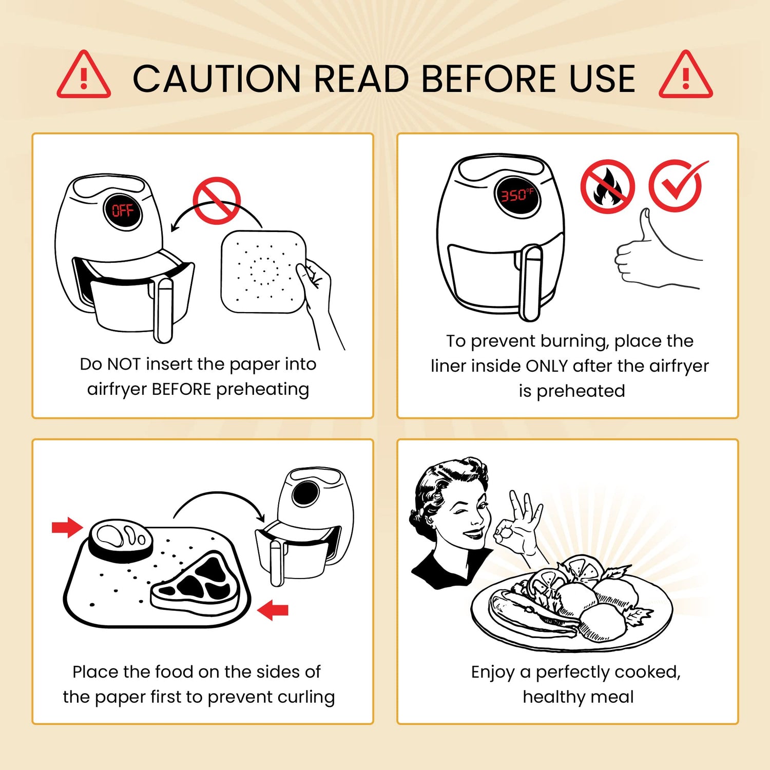 • CONVENIENT PACKAGING – Forget about messy kitchen closets and throwing away excess parchment paper from cutting out perfect liners. Our 8.5 inch airfyrer paper square come in a beautiful box with a resealable bag that is easy to store while keeping the sheets in one place. Our liners have many uses besides baking cakes – use them for preparing, freezing, and storing hamburgers and filets, for wrapping sandwiches and lining Dutch ovens and tortilla presses.