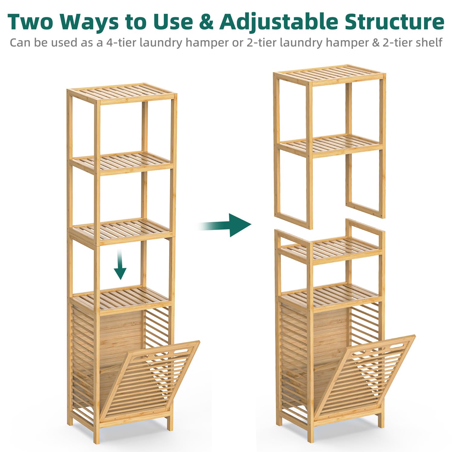 - Two-in-One Design: The 4-tier pull-out clothes hamper features an enhanced structure, providing dual functionality as shelves and bins. It can transform into a 2-shelf laundry hamper with 2-tier shelving unit, offering convenient separate use as required