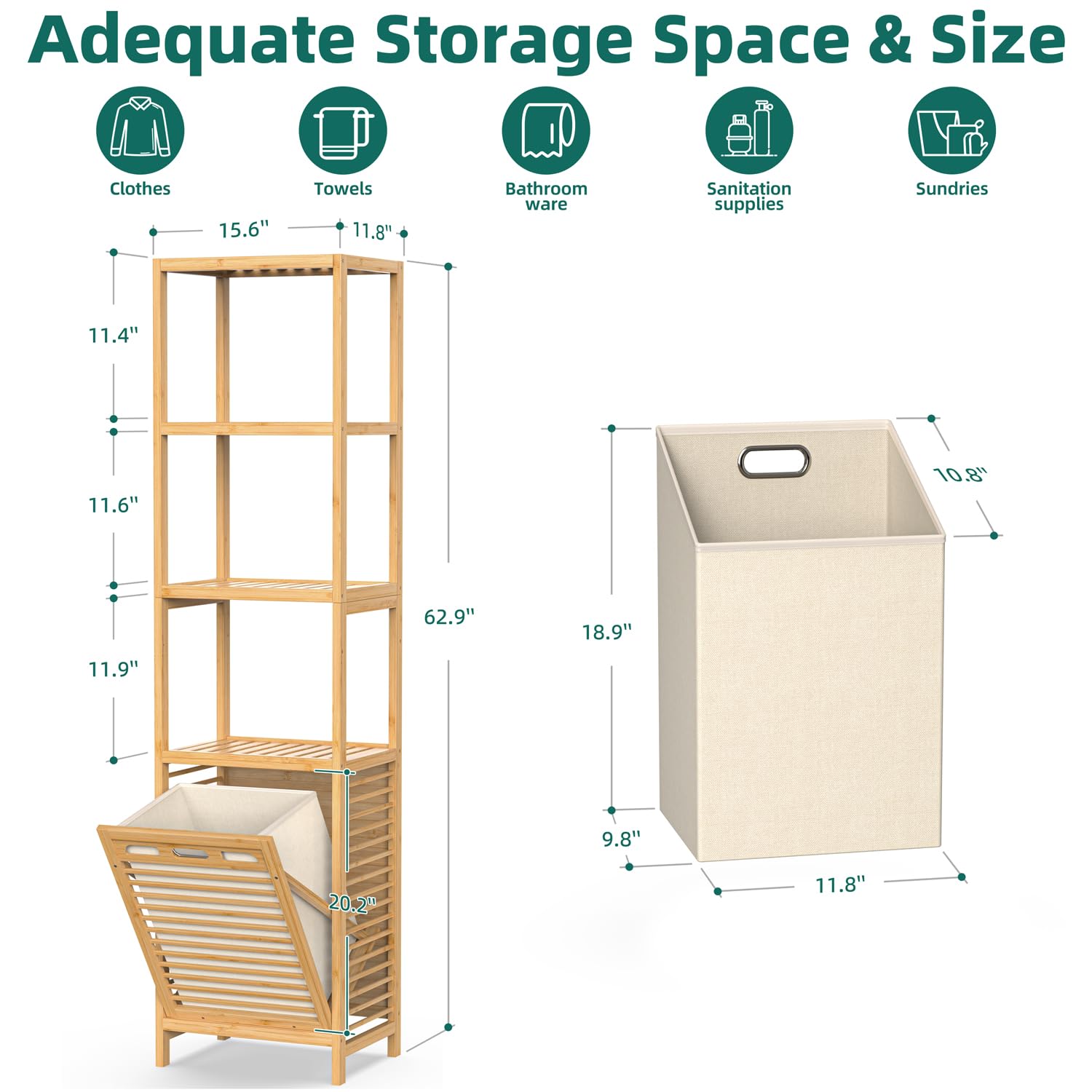 - Ample Storage: 15.6" L x 11.8" W x 62.9" H. The tilt-out bamboo laundry hamper offers generous storage for laundry essentials in spaces like the laundry room, bathroom, or bedroom, and the laundry bins provides a large capacity for dirty clothes and towels