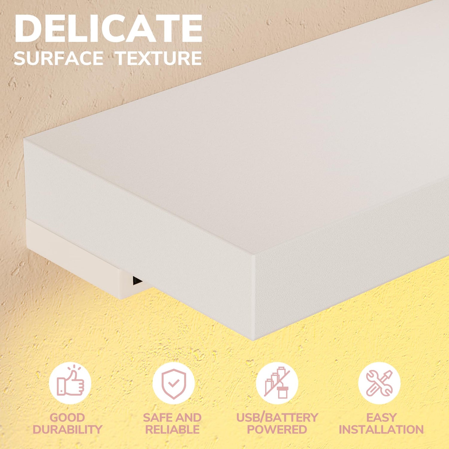 - Convenient Dual-Power LED Lighting: Our wall shelves can be powered by either three AA batteries (not included) or a USB connection. The battery box can be securely mounted to the shelf using the provided 3M tape adhesive, offering a versatile lighting solution for any room. Enjoy the flexibility to light up your space without the worry of finding a power outlet nearby. Please note:Batteries are not included with the purchase.