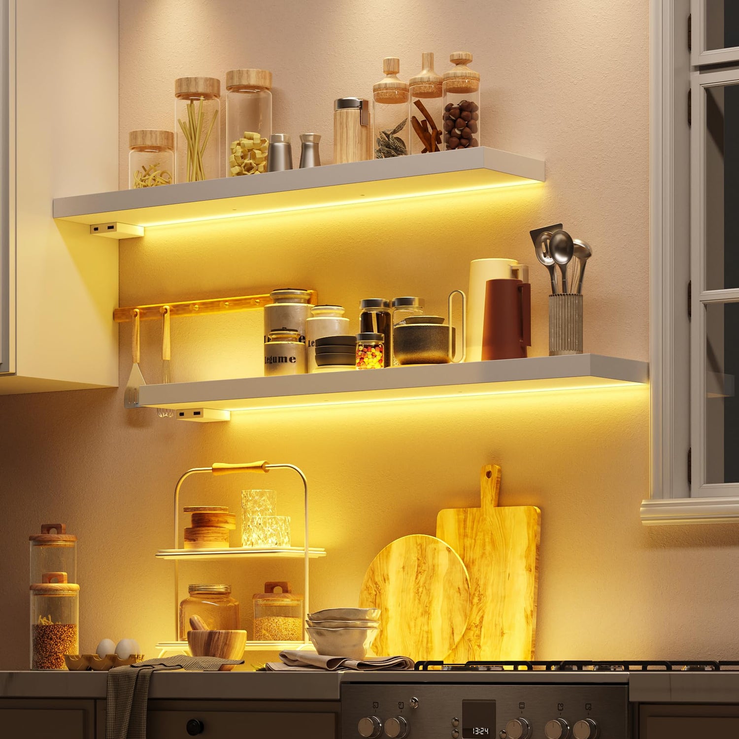BAMEOS Floating Shelves with LED Lights, 31" White Wall Mounted Wooden Shelves with Invisible Brackets, Set of 2, Hanging Wall Shelves for Bedroom, Bathroom, Living Room and Kitchen Decoration