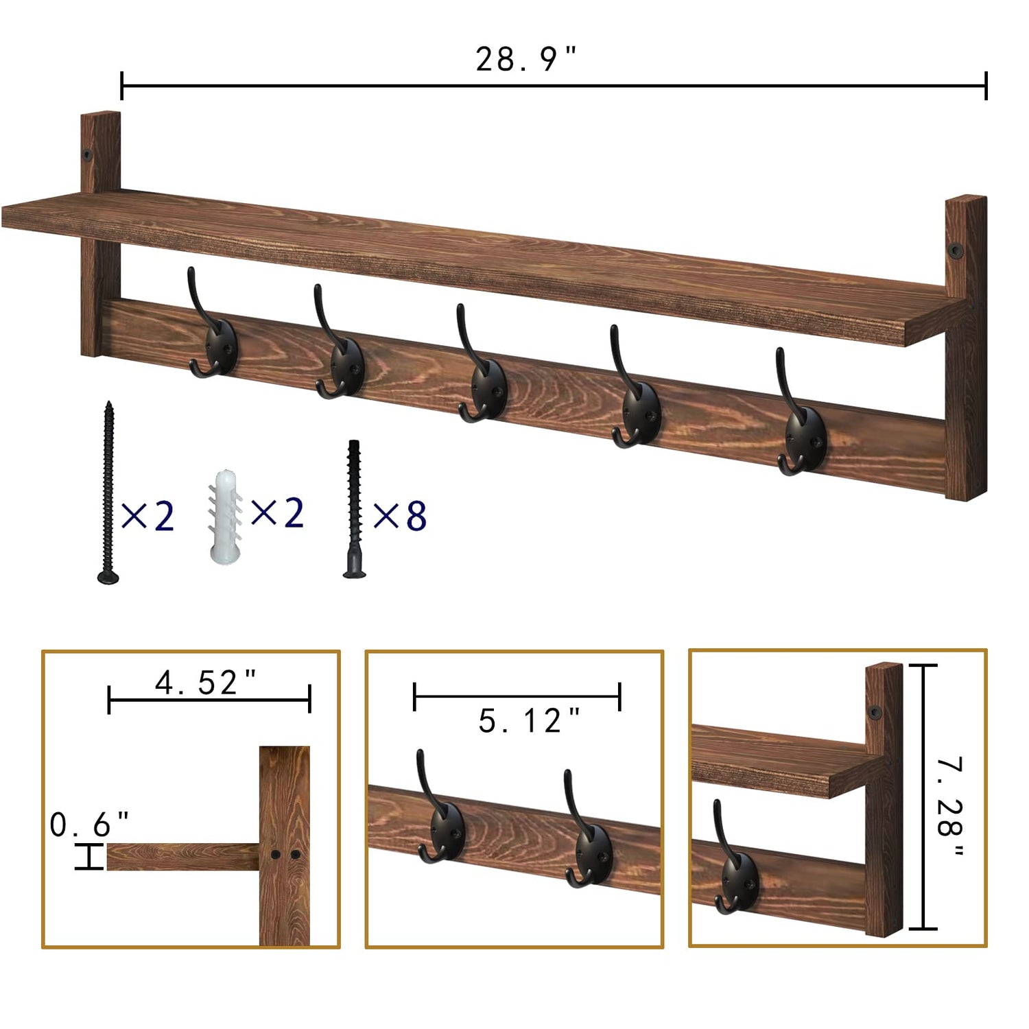 - Additional Upper Shelf Design=More Space for Storage:Special upper shelf design, making this wall coat rack more competitive for storage; Our 28.9 Inch Length coat hooks wall mounted has a larger size,not occupying any floor space, providing your room with more extra space; The coat hooks for wall can be installed in a variety of places for daily needs such as bedrooms, entryway, hall, dining room, kitchen and so on