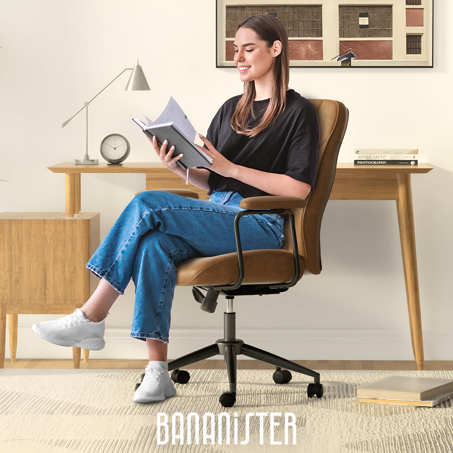 Bananister Brown Leather Desk Chair, Vintage Desk Chair with Wheels and Arms, Height Adjustable Mid Century Modern Desk Chair
