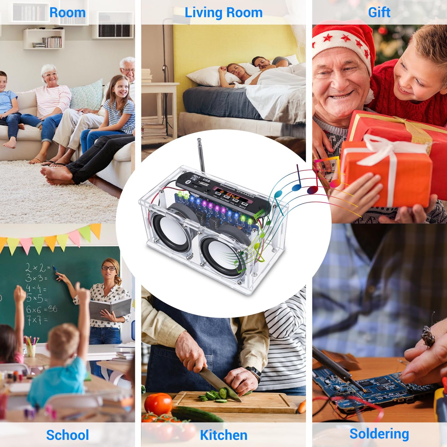 - 【All-in-1 DIY Electronic Kits】DIY speaker kit is multi-functional in one to bring you a new audio experience . Its radio function can allow you to enjoy radio programs anytime, anywhere. The four audio input modes can meet your diverse music playback needs. Not only that, the speaker also supports hands-free calling, and the built-in high-sensitivity microphone makes the call clear and unhindered, ensuring smooth communication.The unique color LED voice-activated flashing light design creates a cool lighting effect and adds a touch of color to your music world.