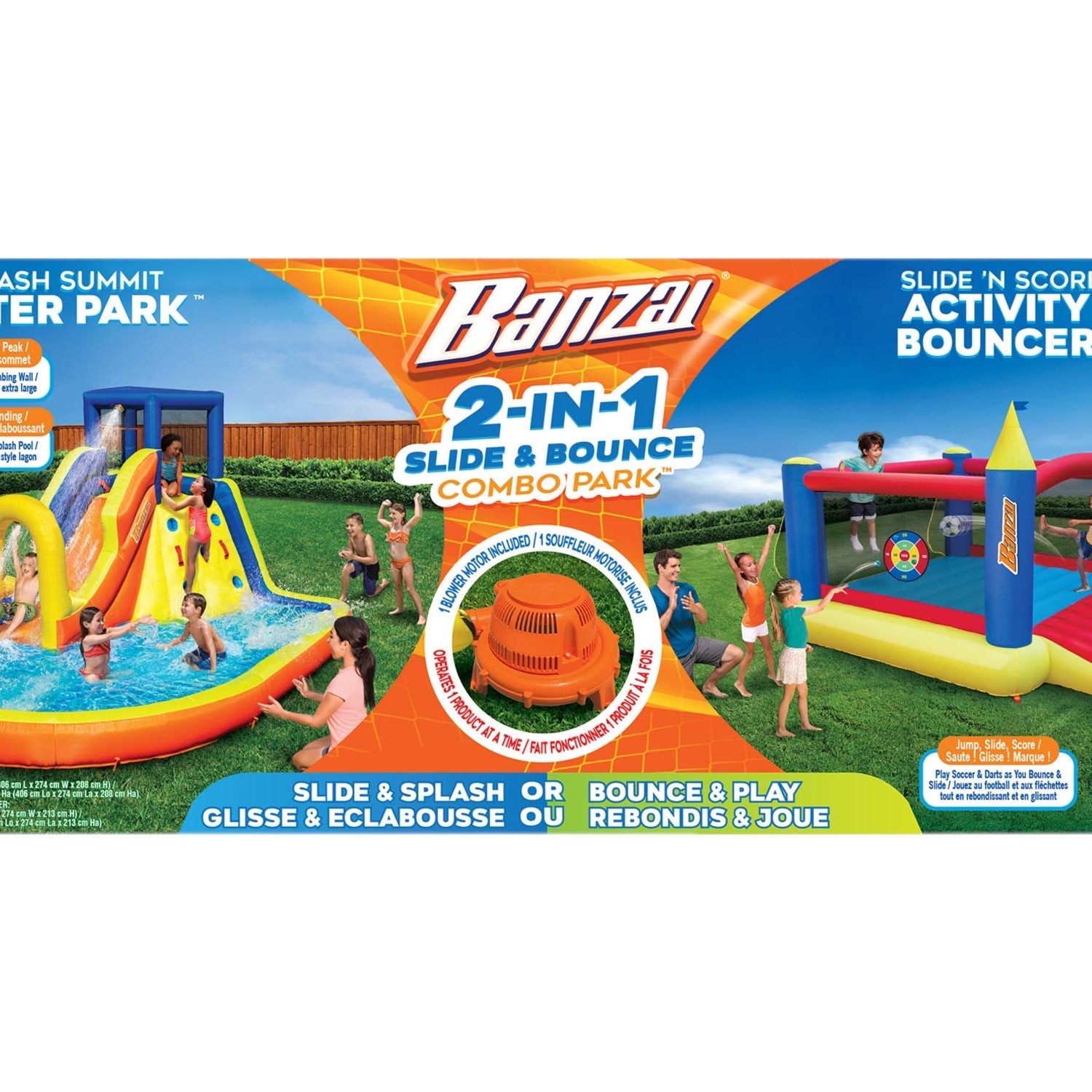 BANZAI Inflatable 13' Water Slide Park Plus 12' Bounce House 2 for 1 Value Pack w Free Air Blower- Inflates in Under 2min- Heavy Duty Kids Adventure Park Pool with Sprinkler 12’x9 XL Bouncy Castle