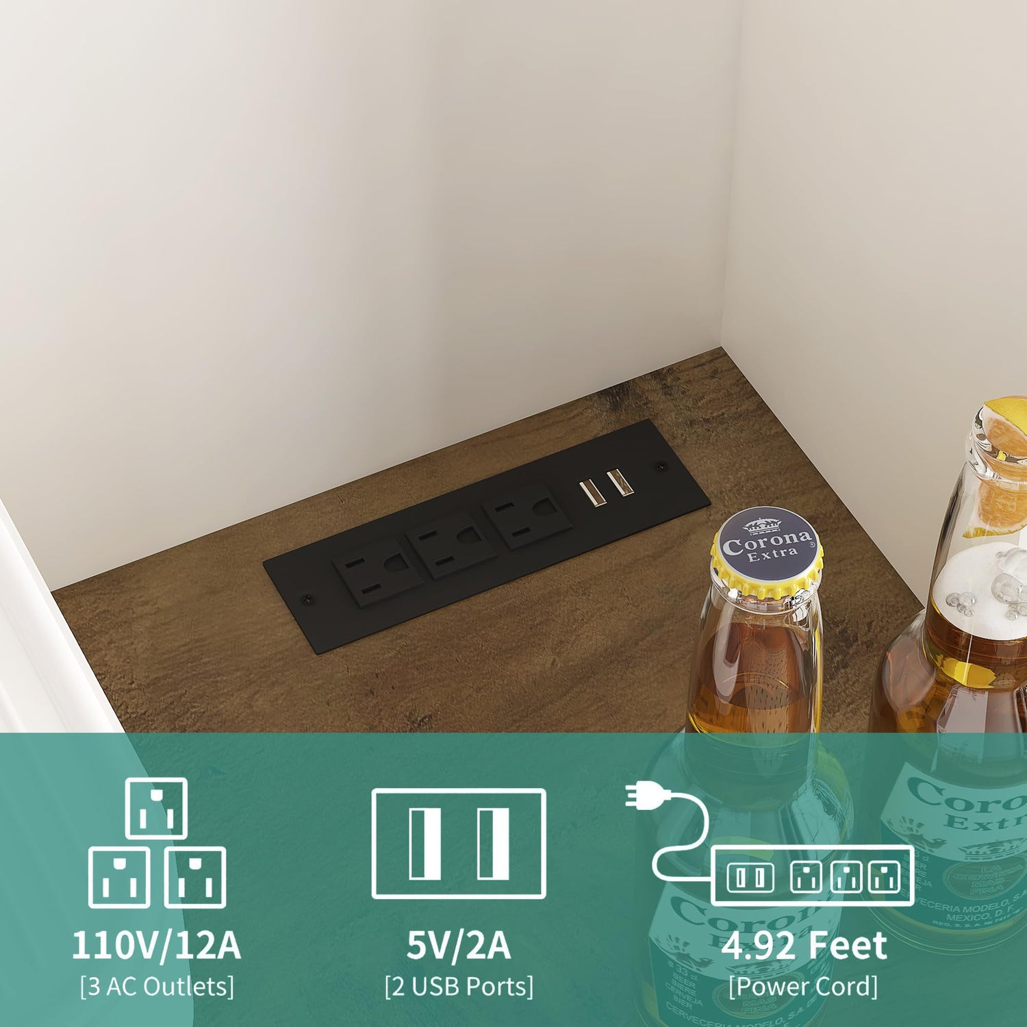 - 【Bar Cabinet with Integrated Charging Station】Stay connected and powered up with our sideboard that comes with 3 AC outlets and 2 USB charging ports. This allows you to charge your microwave, cell phone, computer, and other electronic devices simultaneously. The coffee bar cabinet is also equipped with vibrant LED lights to add a touch of elegance and ambiance to your space