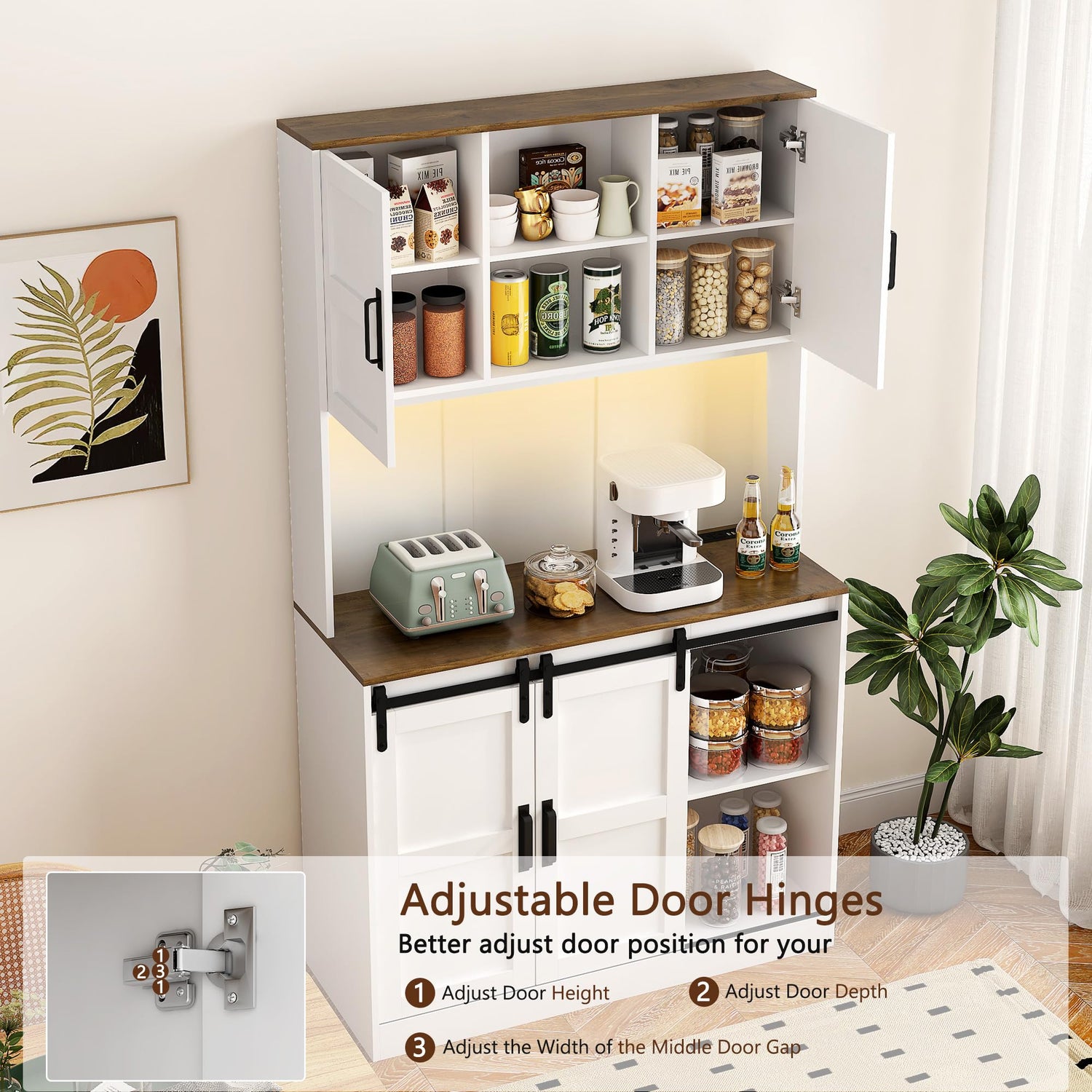 - 【Spacious Storage Solutions】Our kitchen cabinet is a versatile combination of a sideboard and an upper cabinet. The upper cabinet boasts 2 open shelves and 2 enclosed shelves with doors, providing ample storage space while making it easy to find items. The bottom sideboard features 3 shelves and 1 drawer, perfect for organizing kitchen utensils, jars, snacks, and wine. The spacious countertop is ideal for placing a microwave, coffee machine, or your favorite whiskey bottle. Plus, each cabinet has adjustable shelves for flexible storage options