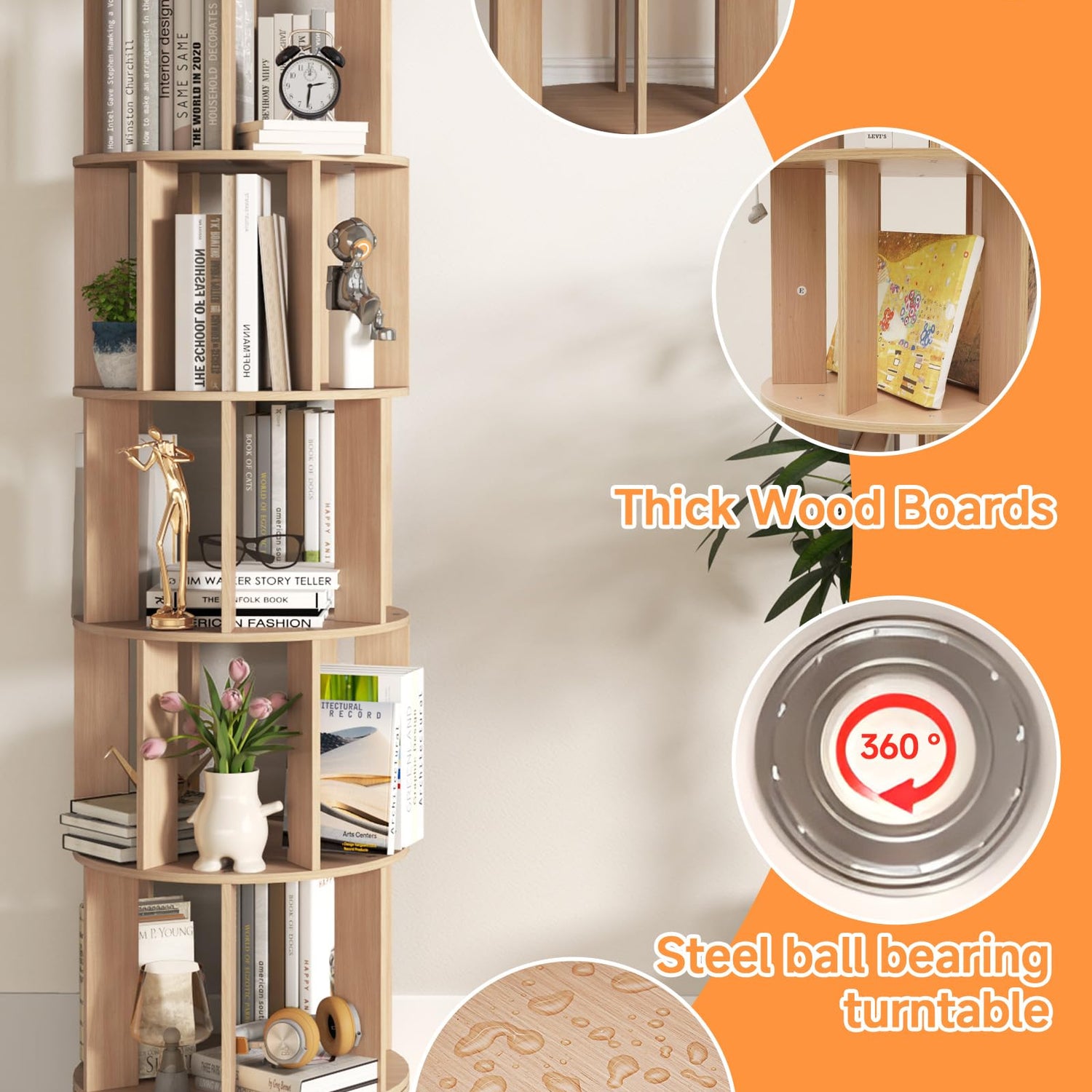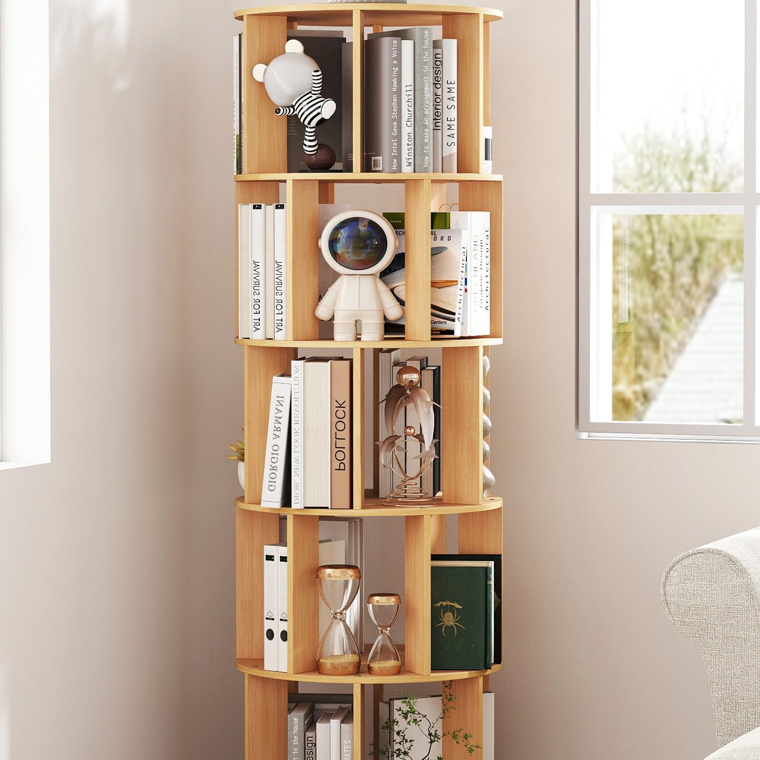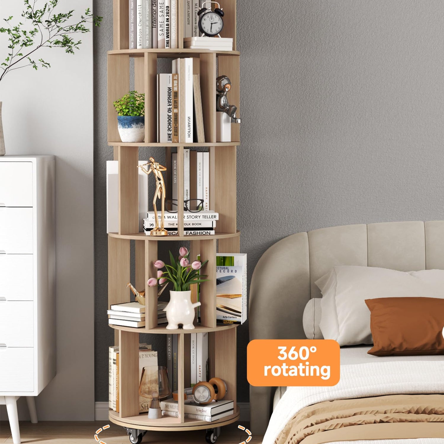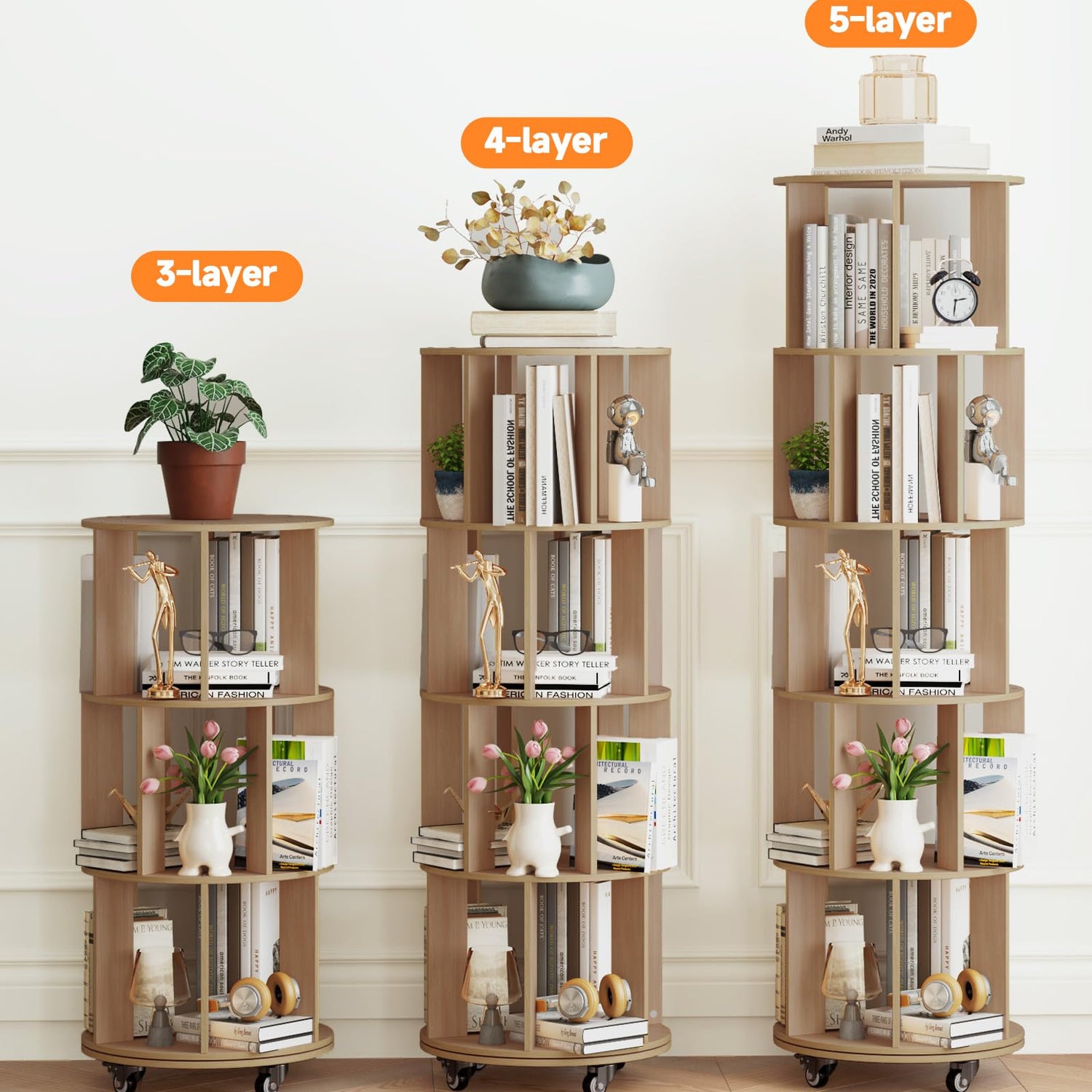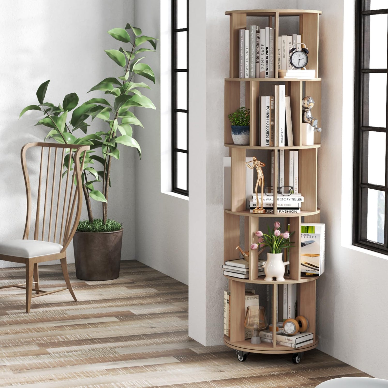Baoz 5-Tier Rotating Bookshelf Tower, 360° Display Stackable Spinning Bookshelf with Wheels, Floor Standing Corner Revolving Bookcase, Rotating Book Shelf for Kids Rooms, Living Room, Bedroom - Wood