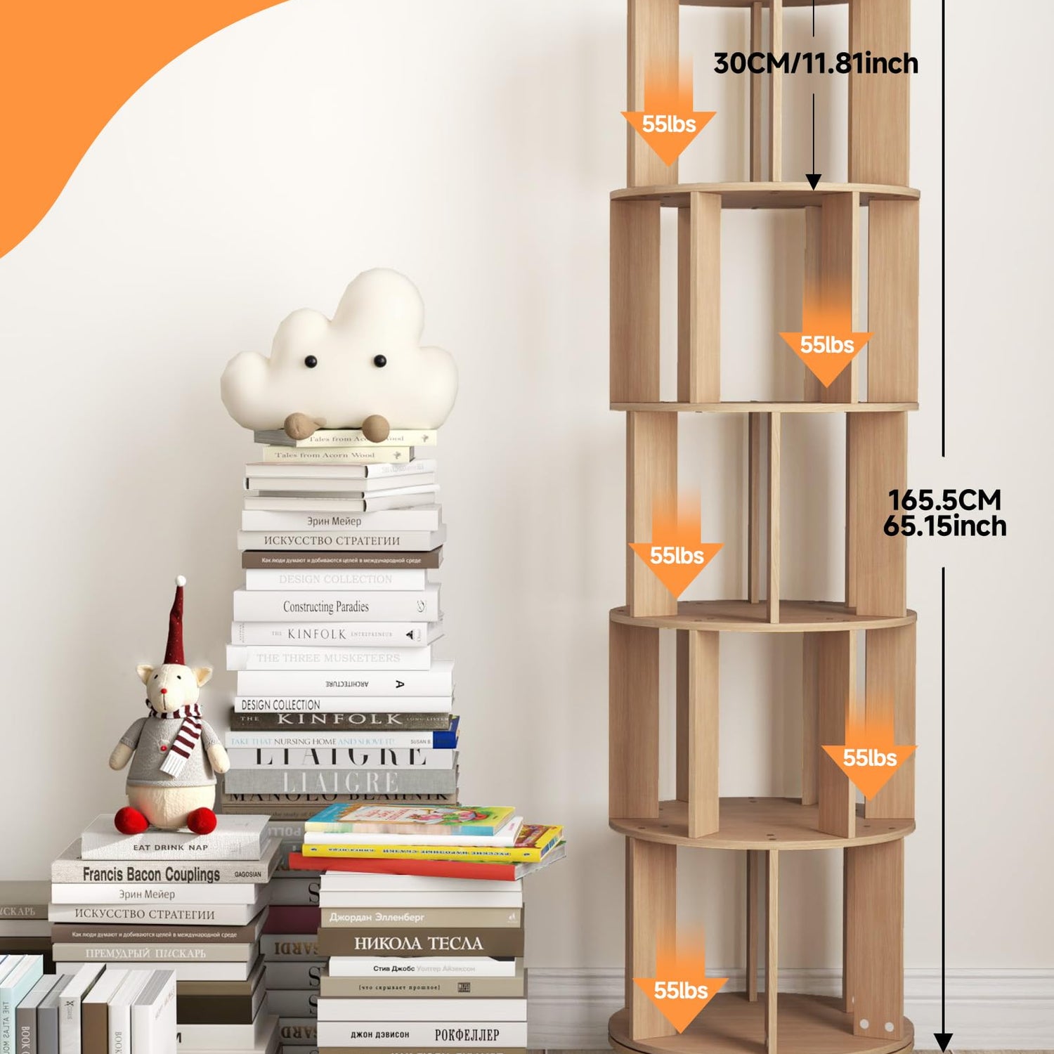 - 【Large Storge Capacity】The overall dimension of kids rotating bookshelf: 18.2''W x 18.2''D x 65.15''H. Our rotating book shelf has 5 tiers, with open top shelve for plants, photo albums or toys. The spinning bookshelf can hold about 125 books, and it can be placed in any position or corner to maximize the use of space