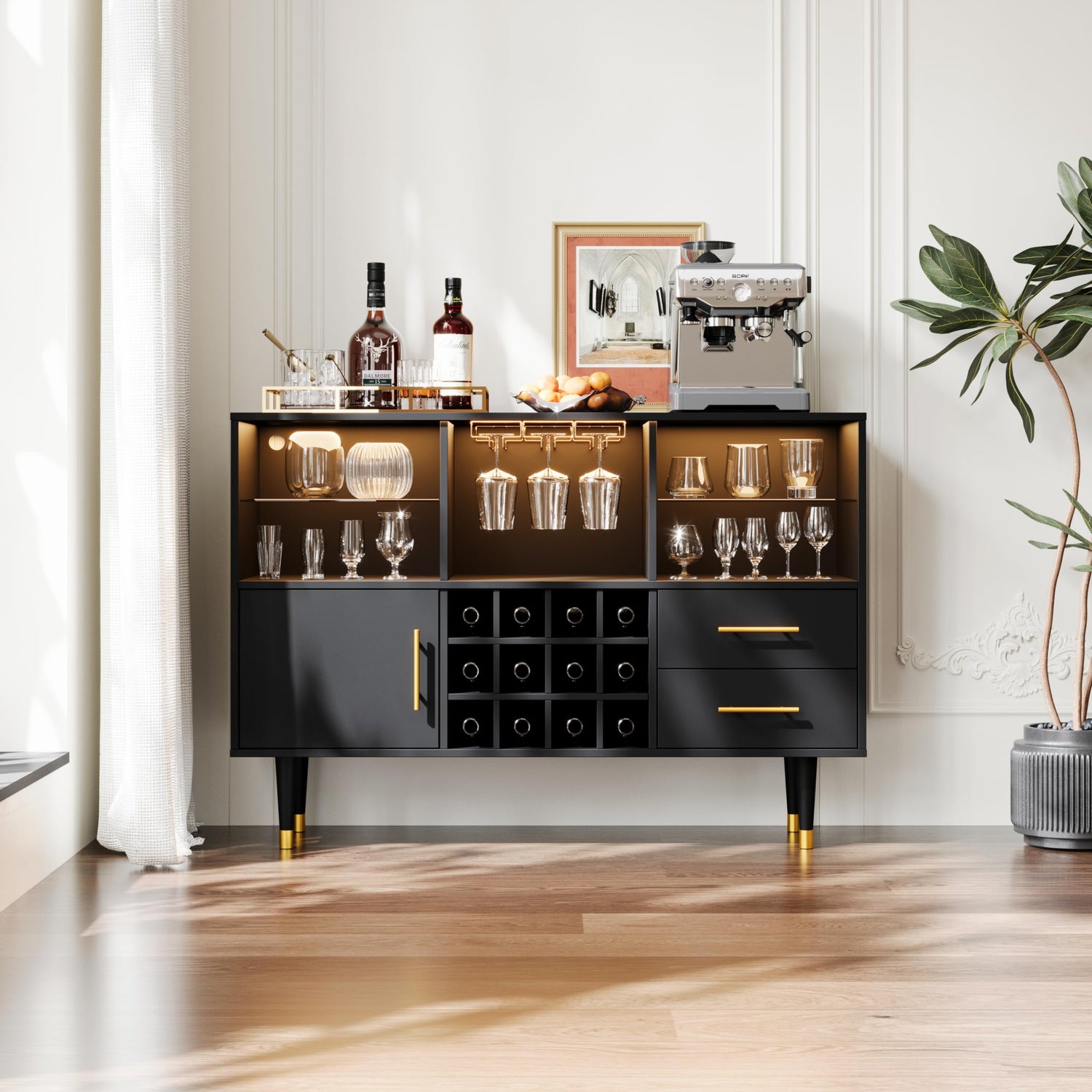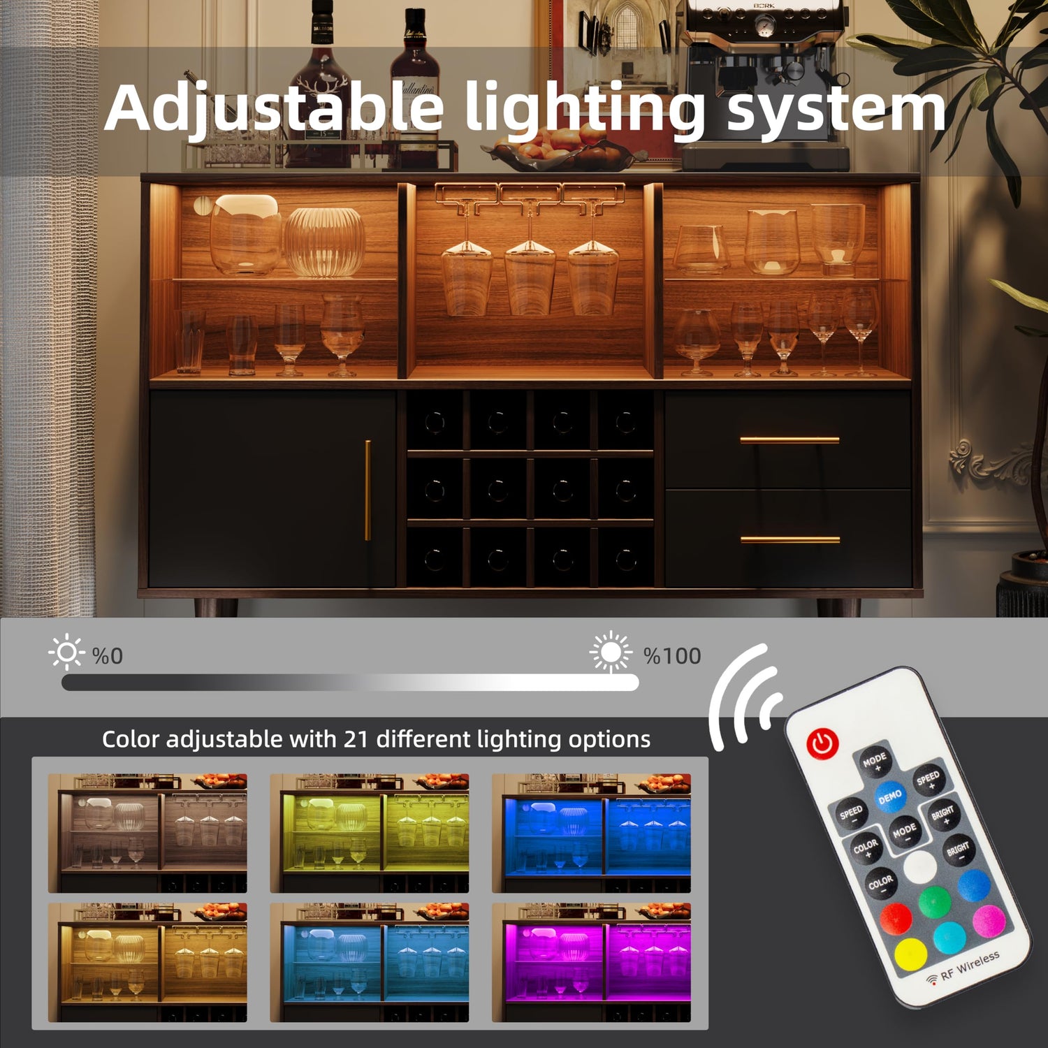 Bar Cabinet and Bar Table - LED Light Charging Station, Buffet Cabinet with Storage, Sideboard Cabinet, Coffee Bar - Ideal for Buffets & Sideboards, Wine and Liquor Cabinet 47 inch Black