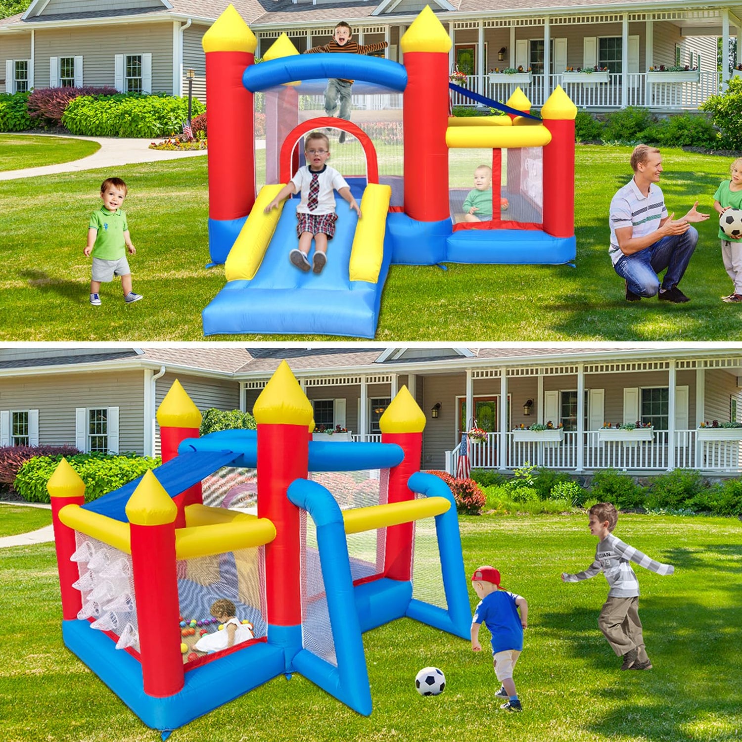 - Multiple Sports Combination Designed for Kids Aged 3-6: Jumping House, Slide, Ball Pit, Basketball Slam Dunk Hoop, Soccer Goal & Ball Throw FUN - Just jumping and the moonwalk feel will keep kids enjoyable for hours .